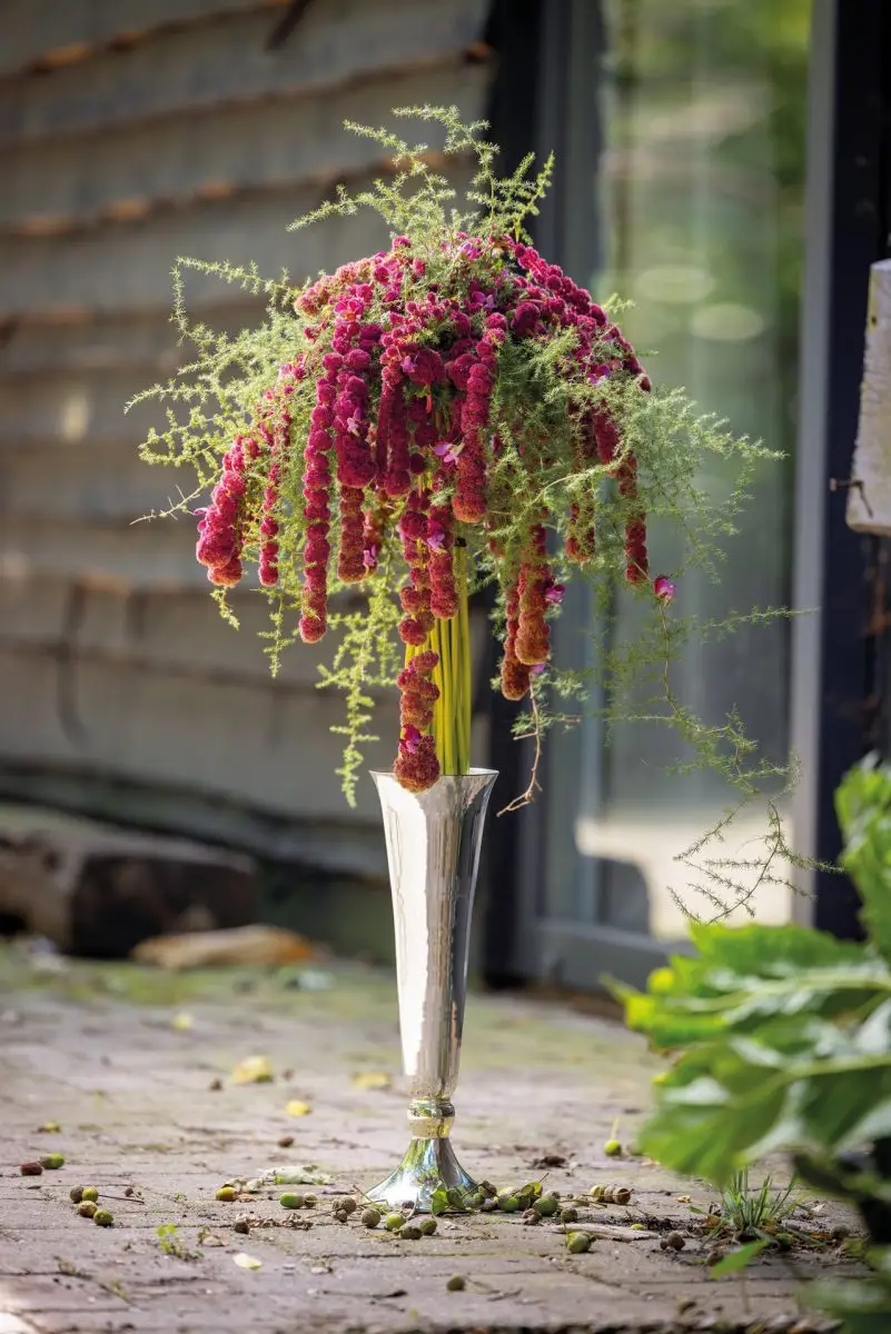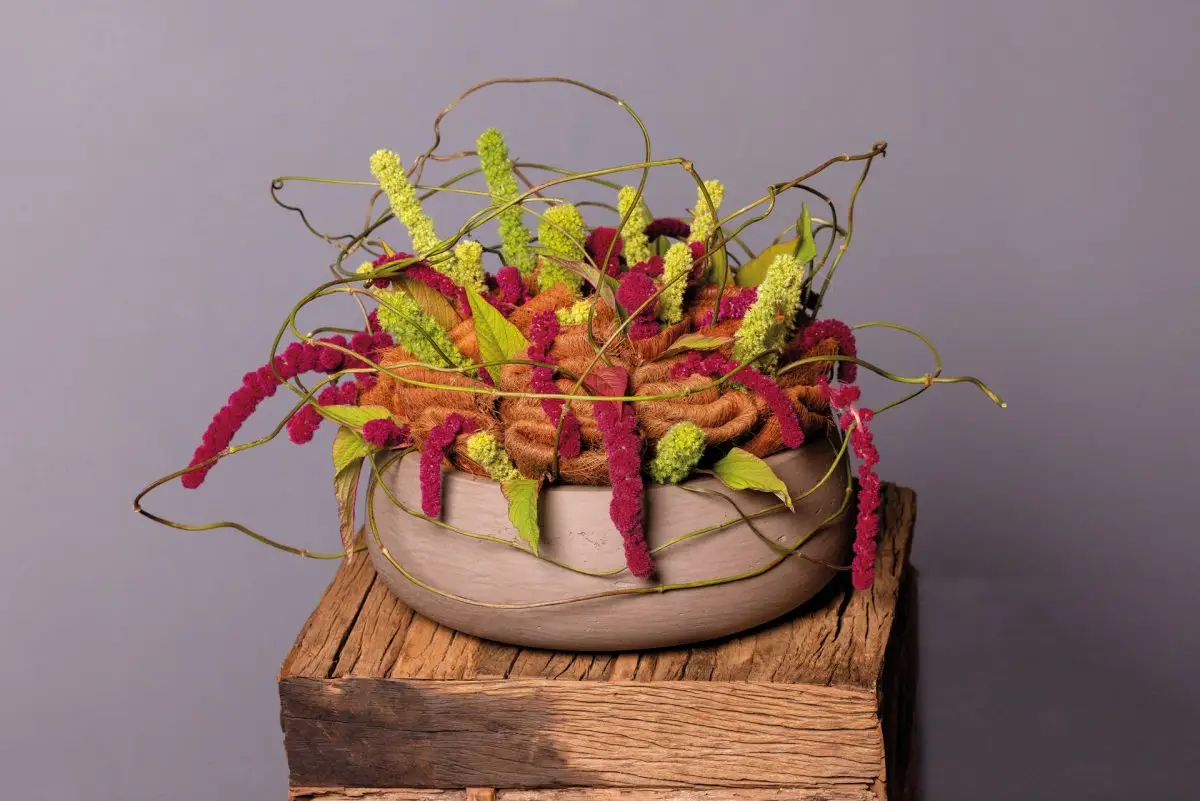 In een robuuste schaal is kokospalmbast gevouwen; deze fungeert als steekmedium voor rode en groene Amaranthus. Kronkelige ranken van wingerd (Ampelopsis) slingeren over het geheel.
