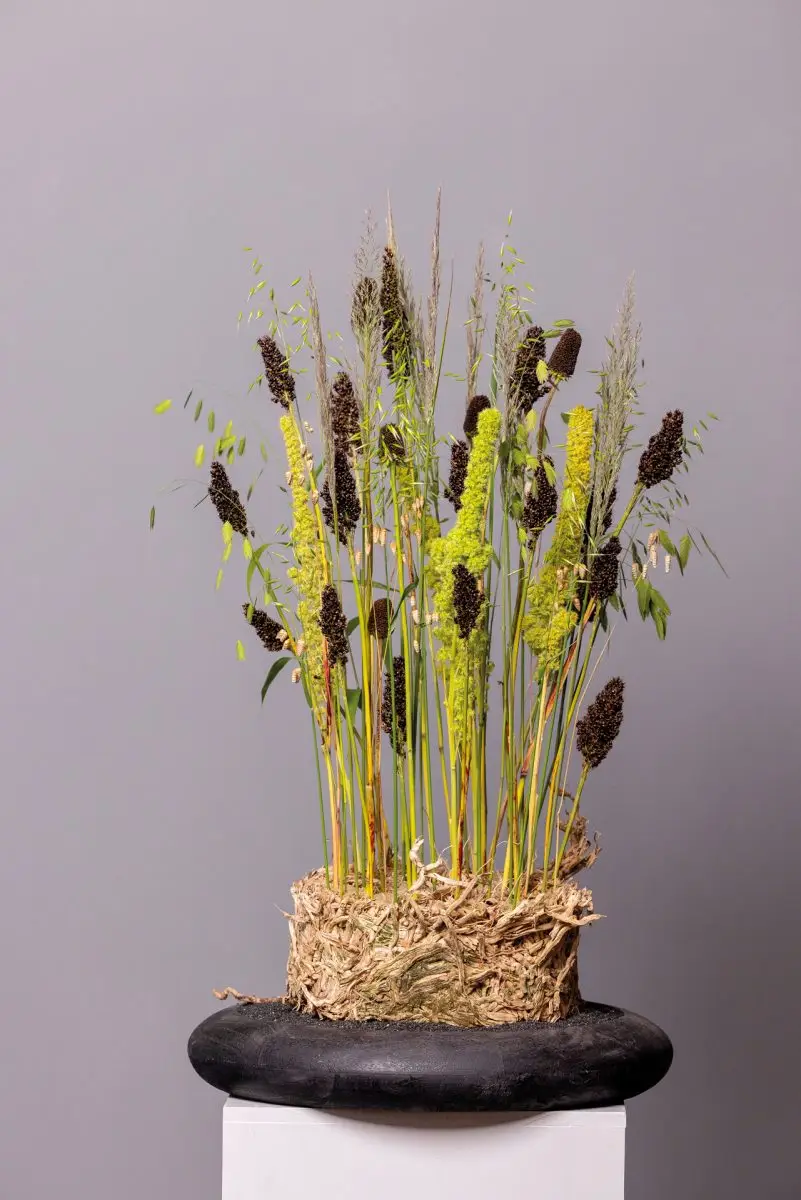 Op een zwarte schaal rust een orchideekluit met daaronder steekschuimblokken. Kwetsbare soorten drinken uit waterbuisjes die tussen de wortels zijn geplaatst, de overige materialen zijn door de kluit in OASIS Floral Foam gestoken. Gebruikte bloemen en grassen: Cymbidium, Chasmanthium, Calamagrostis, Sorghum, Rudbeckia en Amaranthus.