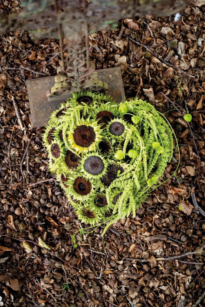 Een OASIS® Eychenne All Black hart is volledig bekleed met deels overlappende, uitgebloeide zonnebloemharten (Helianthus annuus) voor een ingetogen, tactiele huid. Zachte lijnen van groene hang Amaranthus benadrukken het silhouet. De luchtige blaasjes van Cardiospermum halicacabum ‘Love in a Puff’ maken de symboliek wat lichter.