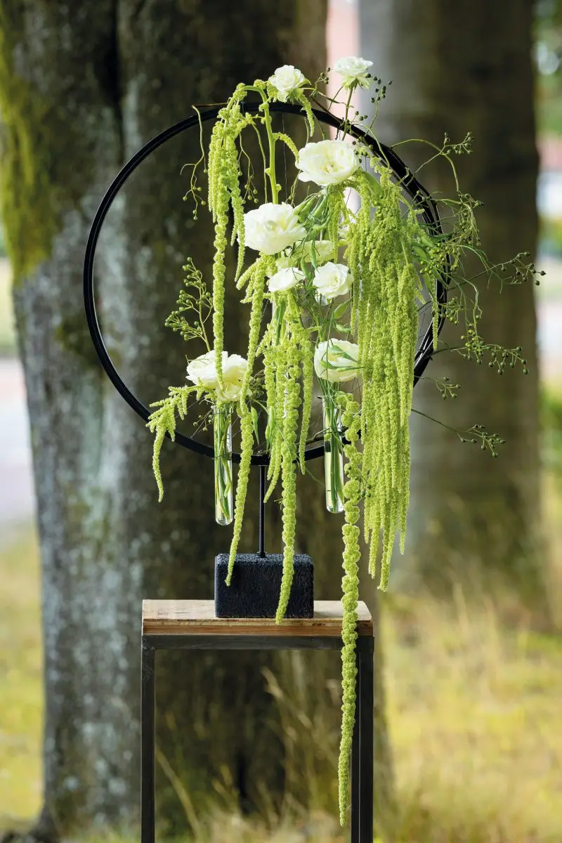 Gebruikte materialen: diverse witte rozen, hang Amaranthus, takken Rosa ‘Corallo’ en knopherik ranken met peulen (Raphanus raphanistrum).