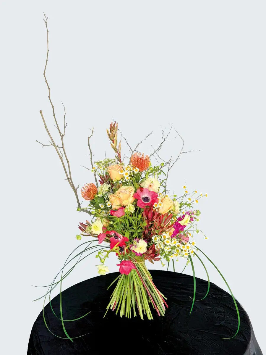 This large, sustainable arrangement spans nearly a metre in width and is built on a striking base made from the roots of the Davallia fern. These roots dry beautifully, allowing the bowl-shaped structure to be reused time and again. The frame beneath – made from thick aluminium wire – is completely hidden, serving purely as a strong technical support. Long strands of fern root have been woven and layered into an intricate, textured network, adding depth and natural movement. Around 200 water tubes are discreetly embedded throughout the design, making it easy to refresh and reuse each one. Though robust in construction, the overall effect is organic and artistic – a perfect balance of structure and softness.