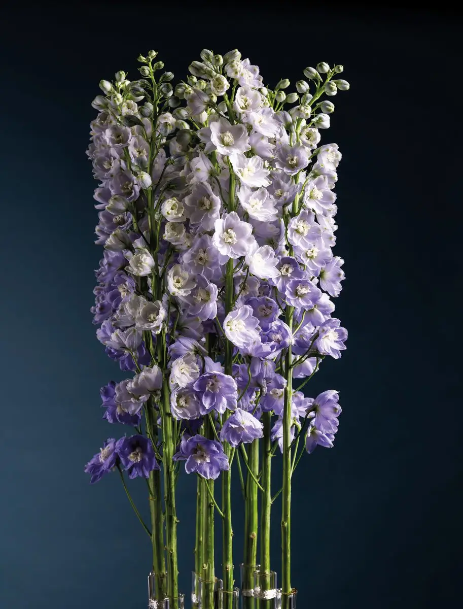 buisjes Delphinium in een krachtige, samengebonden groep voor maximale rust en focus.