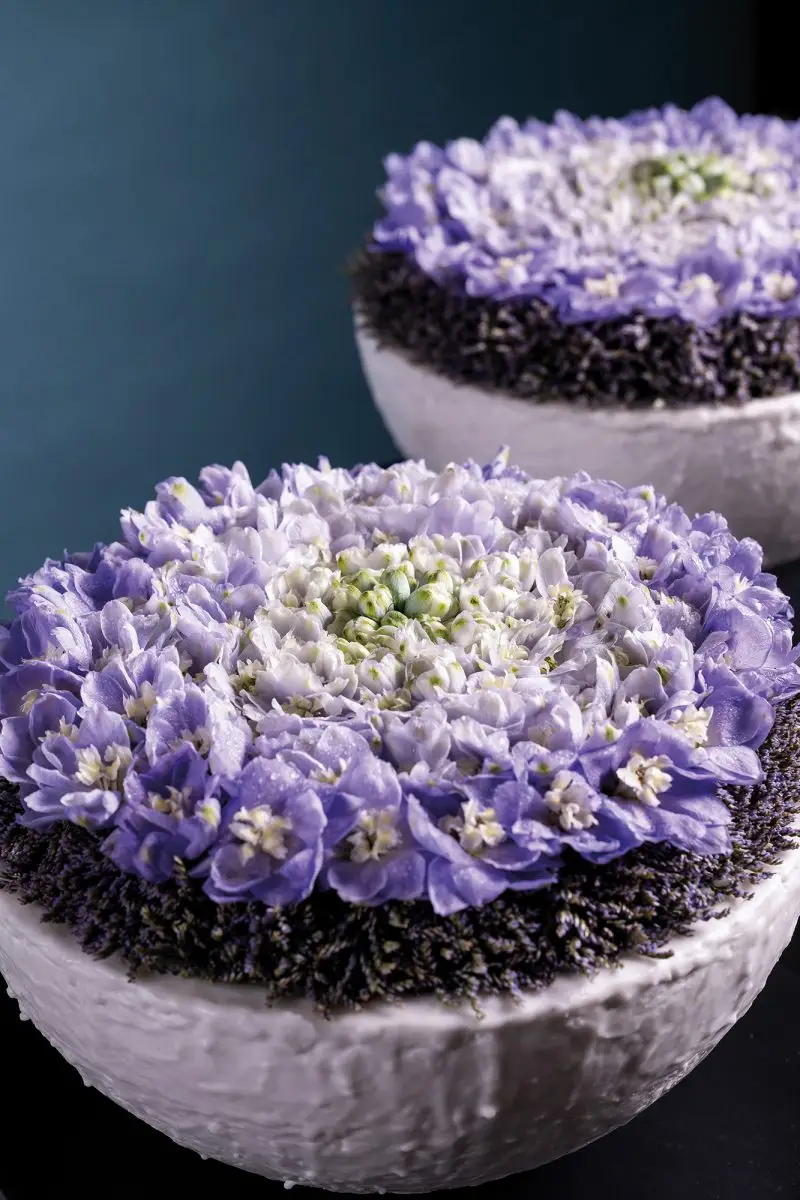 In deze winterse compositie vormt kaarsvet een ‘ijzige’ huid over de twee halve bollen van piepschuim. In de bollen is bio steekschuim geplaatst waarvan de buitenrand compact is opgestoken met Limonium. In het midden is een mooie nieuwe soort Delphinium compact en strak verwerkt als bovenlaag. Het beeld