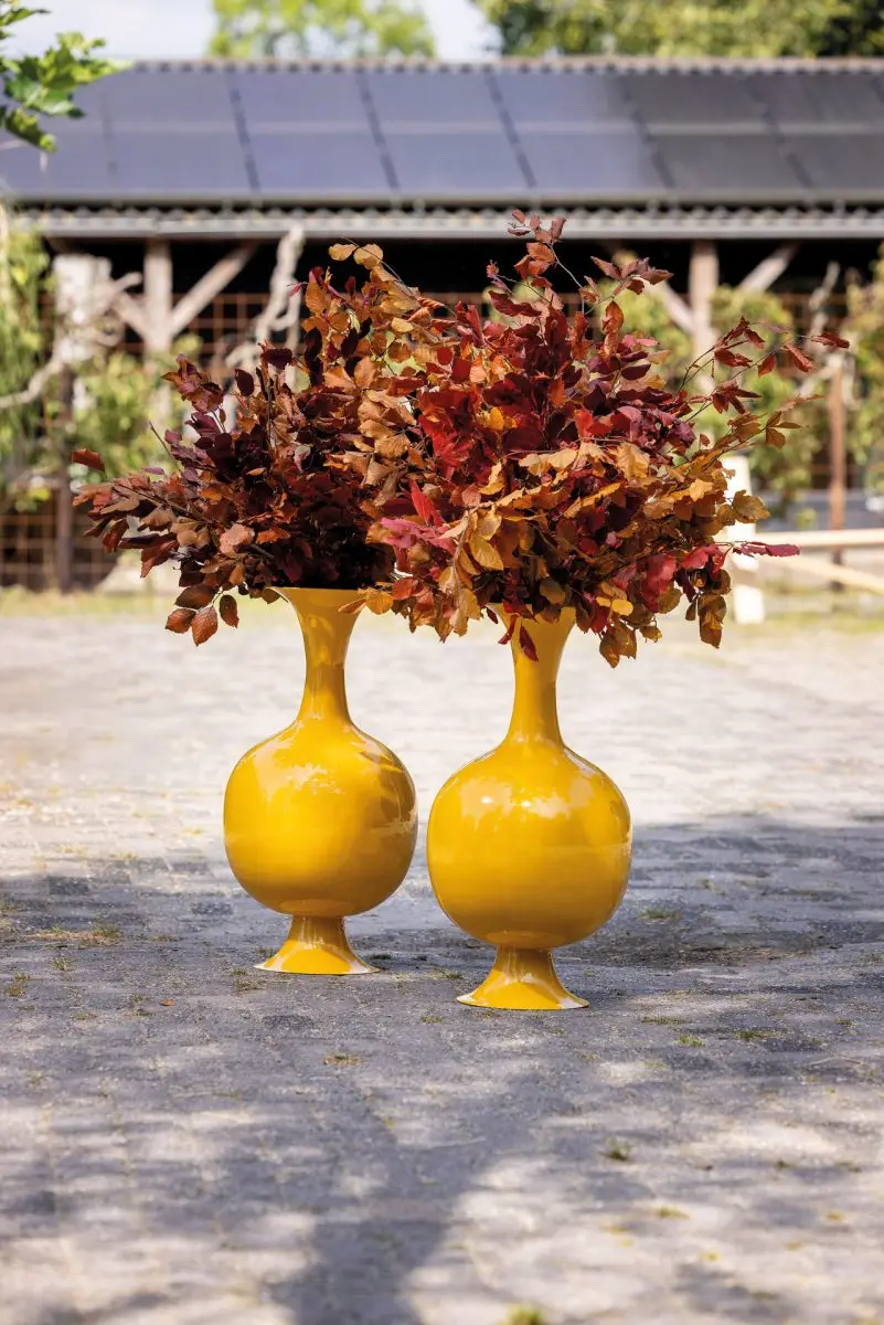 Twee zongele vazen zijn gevuld met takken geprepareerd beukenblad (Fagus sylvatica). Het stelt de mooie herfstkleuren en de nervatuur centraal.