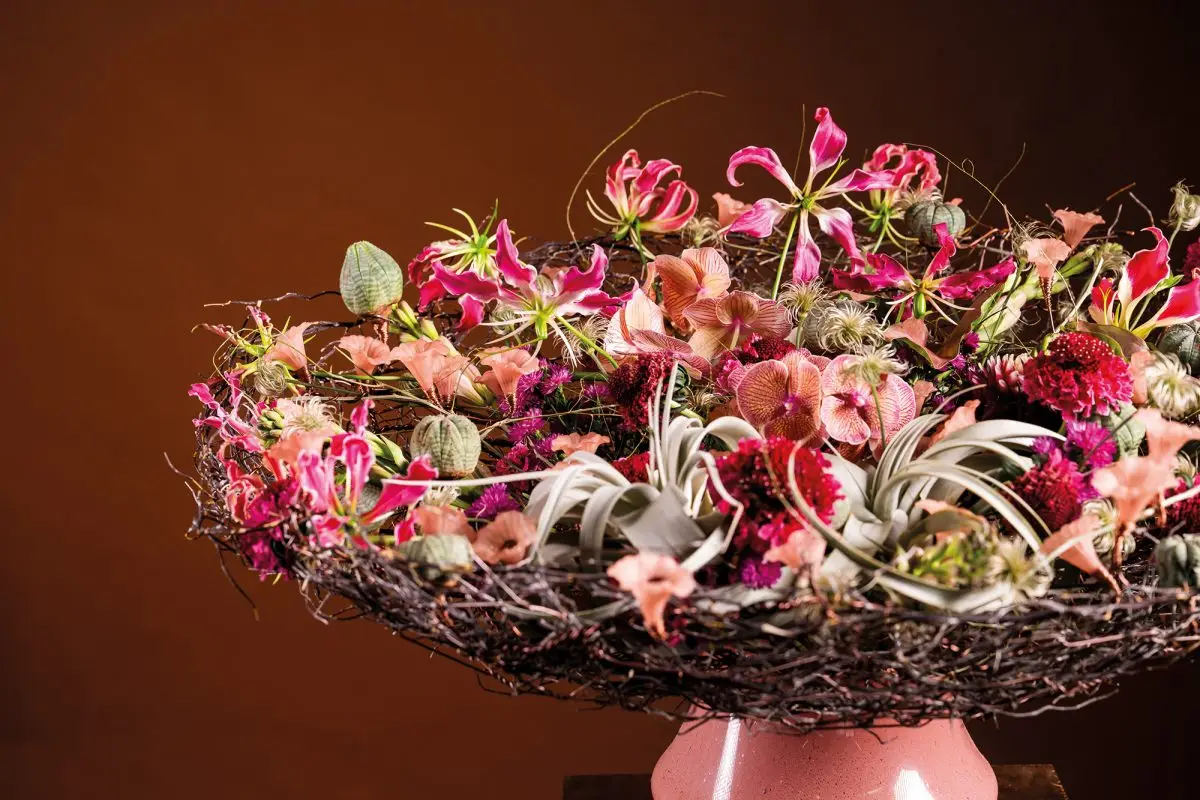Twee cilindervazen op voet zijn strak omwonden met gedroogde takken, waarbij de strakke en nette bindingslijnen bewust onderdeel zijn van het ontwerp. Tussen de takken worden bloemen geklemd, wat snel en efficiënt werken mogelijk maakt, mits het hout volledig droog is – verse takken krimpen namelijk nog. Bloemsoorten als Sanguisorba en Gloriosa komen in deze sobere setting elegant tot hun recht.