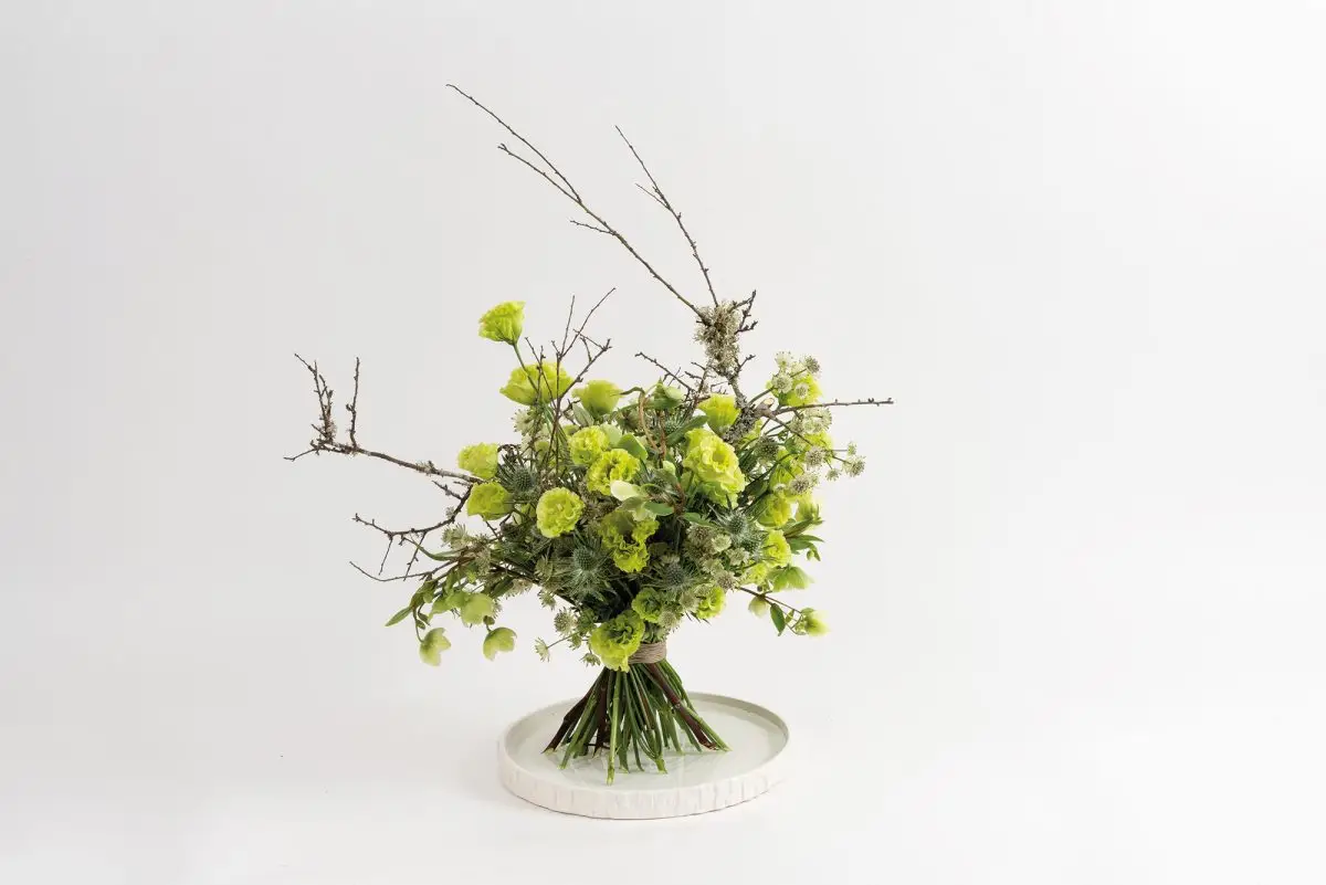 Helleborus, lisianthus, Eryngium en Viburnum zijn in dit boeket verwerkt op een armatuur van voorjaarshout. De constructie geeft het arrangement duidelijke beweging en richting. Het aantal gebruikte stelen en de losse opbouw maken van dit werk een eigentijdse interpretatie van het Nederlandse handgebonden boeket.