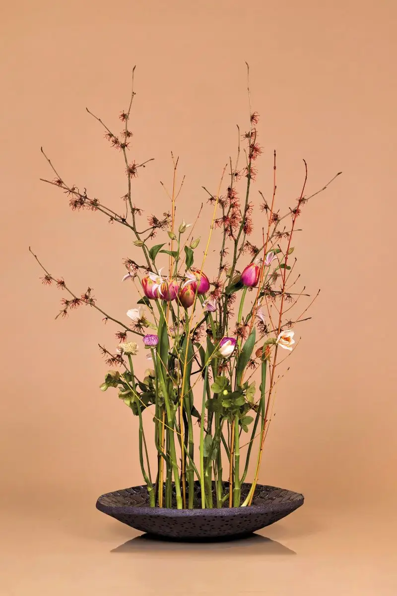 Fijne, grillige lijnen van Hamamelis en Cornus tekenen het silhouet en brengen hoogte en luchtigheid. Daartussen bewegen Clematis ‘Kansas’ stelen. De ronde bloemvormen van Franse tulpen, ranonkels, narcissen en Helleborus zorgen voor ritme en herhaling.
