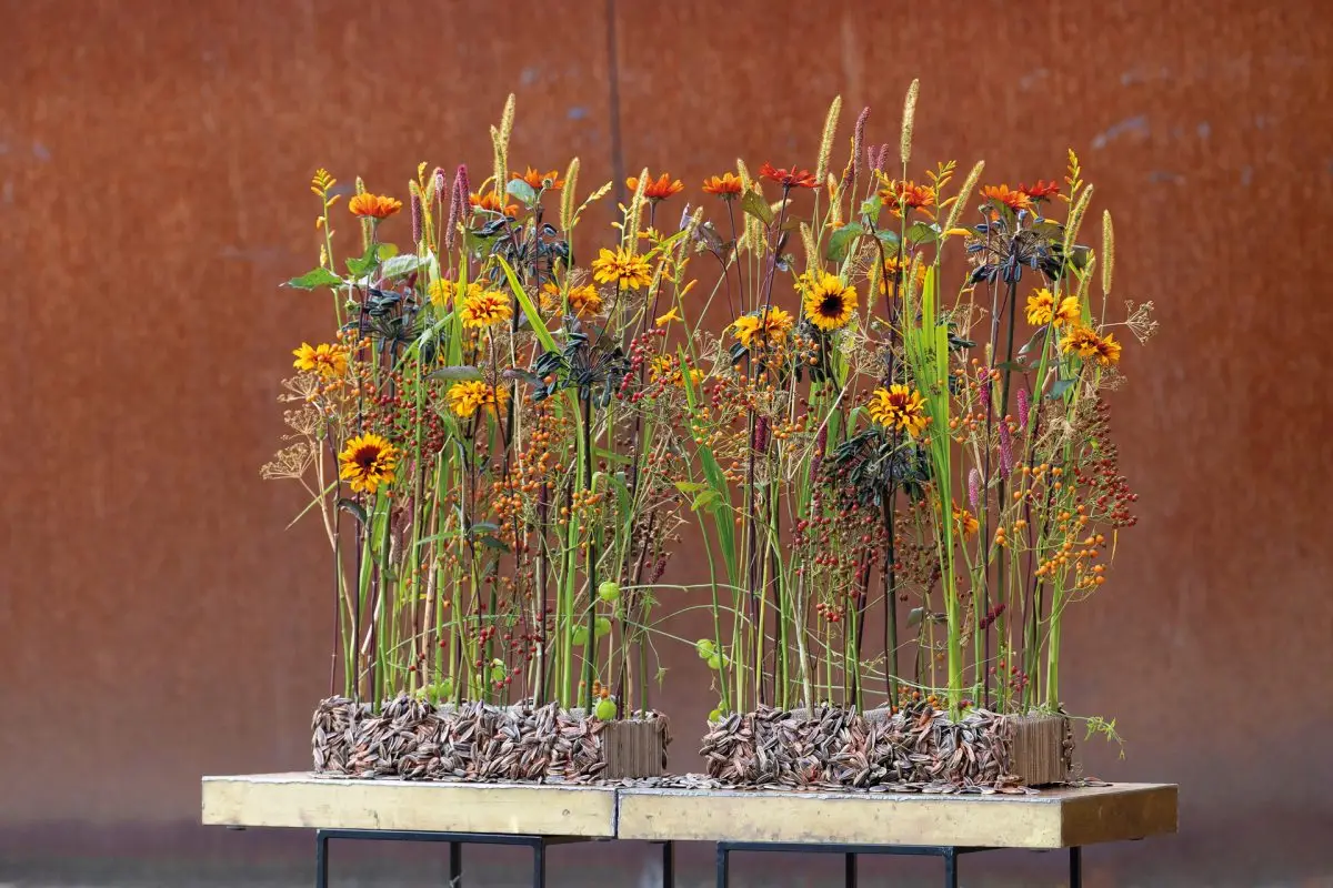 Een duurzaam object van karton, rondom beplakt met gedroogde zonnebloempitten voor textuur. In de geribbelde kartonnen blokken zijn een aantal mooie Rosa ‘Corallo’ takken geplaatst met wat ranken van de Cardiospermum halicacabum ‘Love in a Puff’. De open structuur laat zich kort voor de plechtigheid vullen; lijnen, pluimen en zaad dozen geven ritme en reliëf en maken personalisatie met tuin bloemen mogelijk. Materialen: siergrassen, pimpernel (Sanguisorba), uitgebloeide Agapanthus met zwarte zaad dozen, Crocosmia en Heliopsis.
