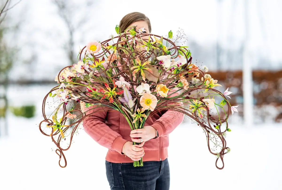 Voor de constructie van de boeketten gebruikte Magdalena Kahlima Oasis-aluminiumdraad. ‘Dit biedt precisie en stabiliteit, terwijl het licht en natuurlijk van uitstraling blijft. Technische elementen blijven zichtbaar en worden bewust geïntegreerd in het geheel van het ontwerp.’
