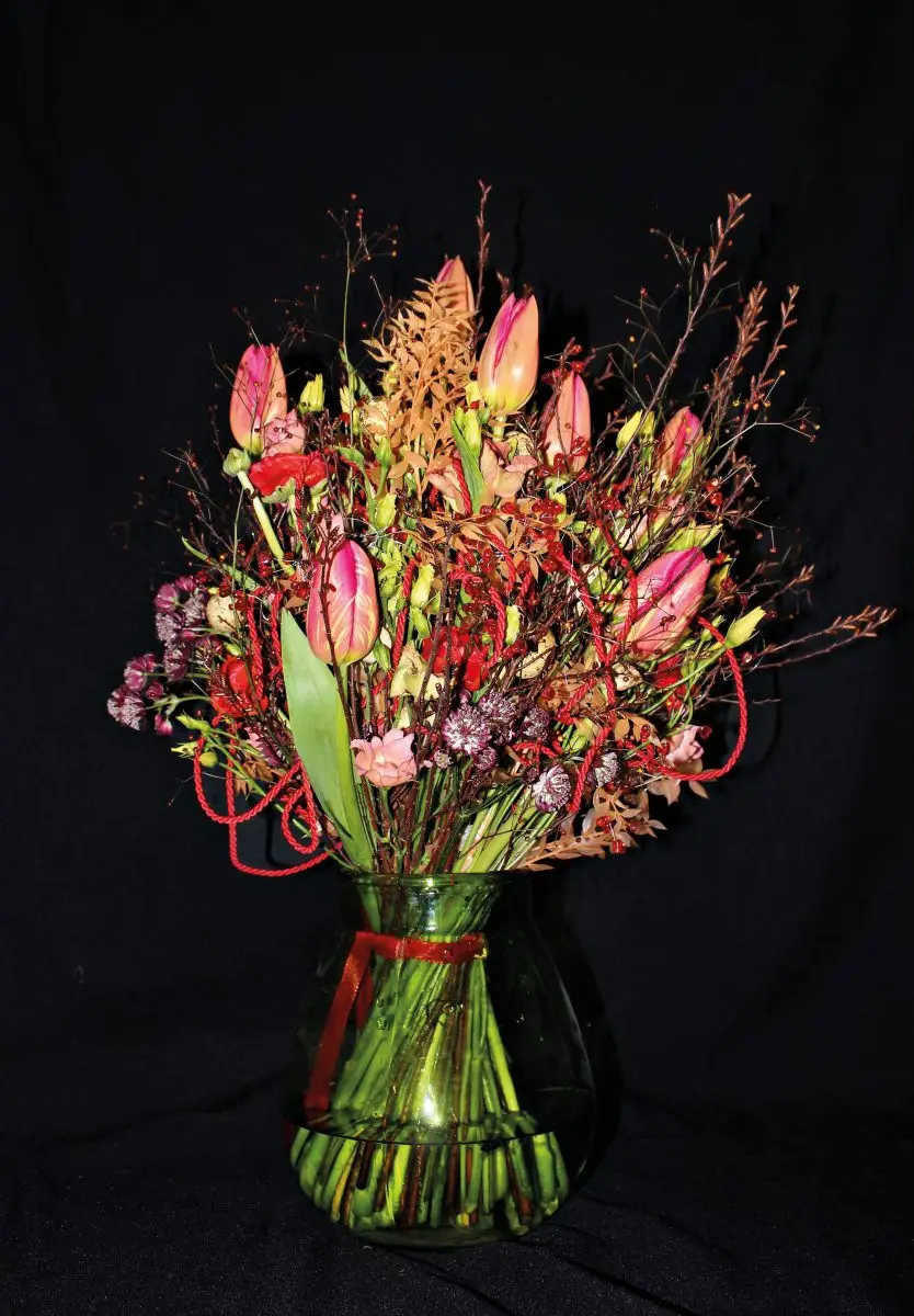 In dit boeket werden onder meer Astrantia ‘Star of Love’, tulpen ‘Fra La Romaine’, Talinum paniculatum ‘Long John’, Myrica gale, Cornus alba ‘Sibirica’ en lisianthus verwerkt.