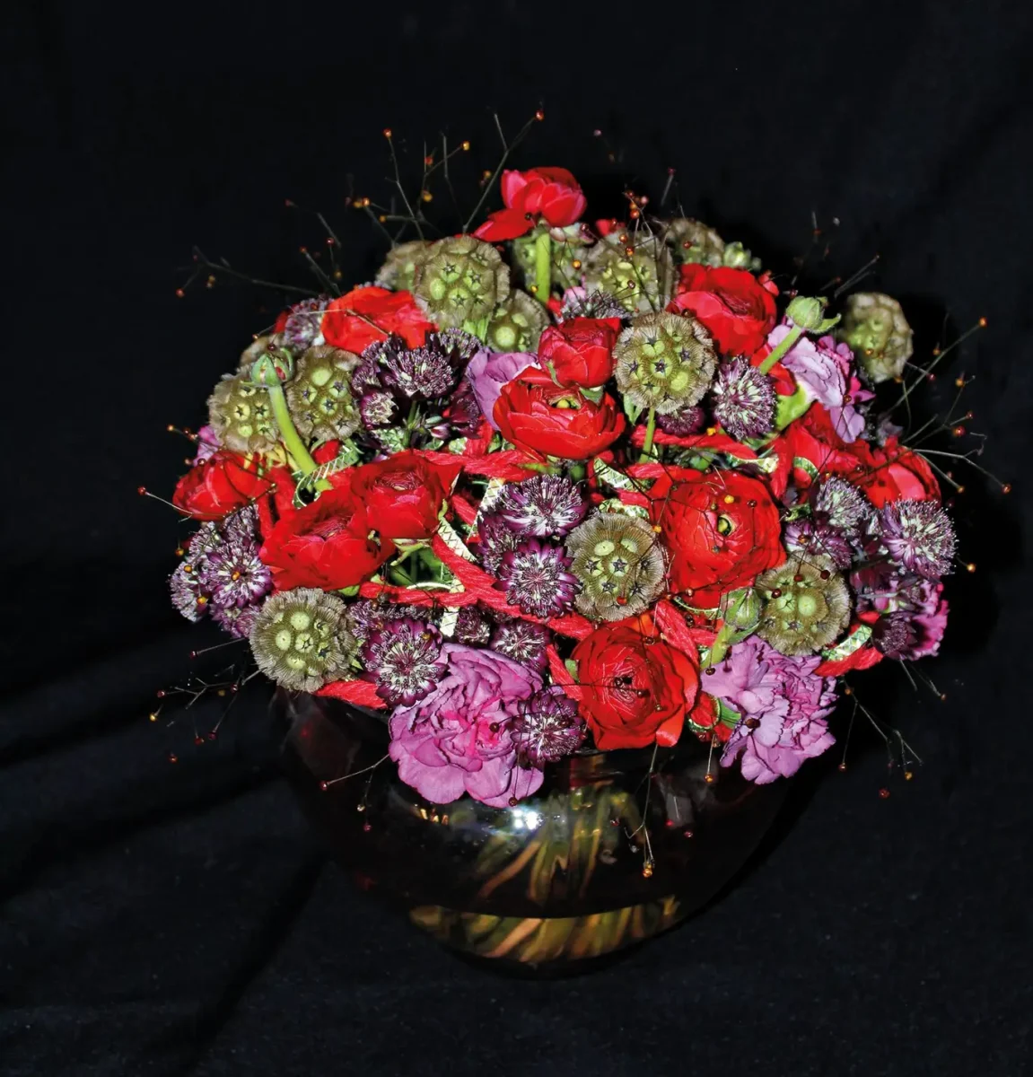Magdalena Kahlina maakte dit boeket met onder meer Astrantia ‘Star of Love’, Dianthus ‘Hypnosis’, ranonkel ‘Elegance Red, zaadhoofden van Scabiosa stellata, Talinum paniculatum ‘Long John’.
