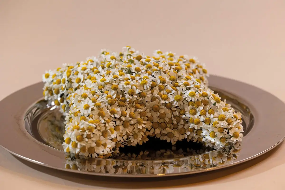 Uit OASIS Renewal Foam is een kussenvorm gesneden. Deze is opgestoken met bloemen van Tanacetum parthenium ‘Single Vegmo’.