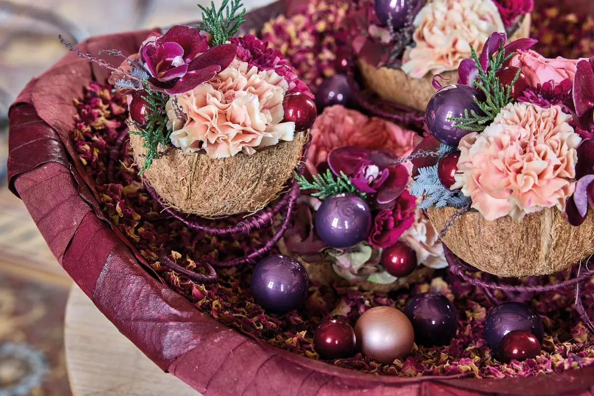 mit Blumenschaum versehen und reichlich mit lachsfarbenen Nelken und Rosen, weinroten Chrysanthemen und Phalaenopsis gefüllt. Ein Chamaecyparis-Zweig und Kugeln in Rot- und Violetttönen verstärken die weihnachtliche Stimmung. Mit Bändern umwickelter Metalldraht bringt die Kokosnussnester auf unterschiedliche Höhen, was für mehr Tiefe sorgt.