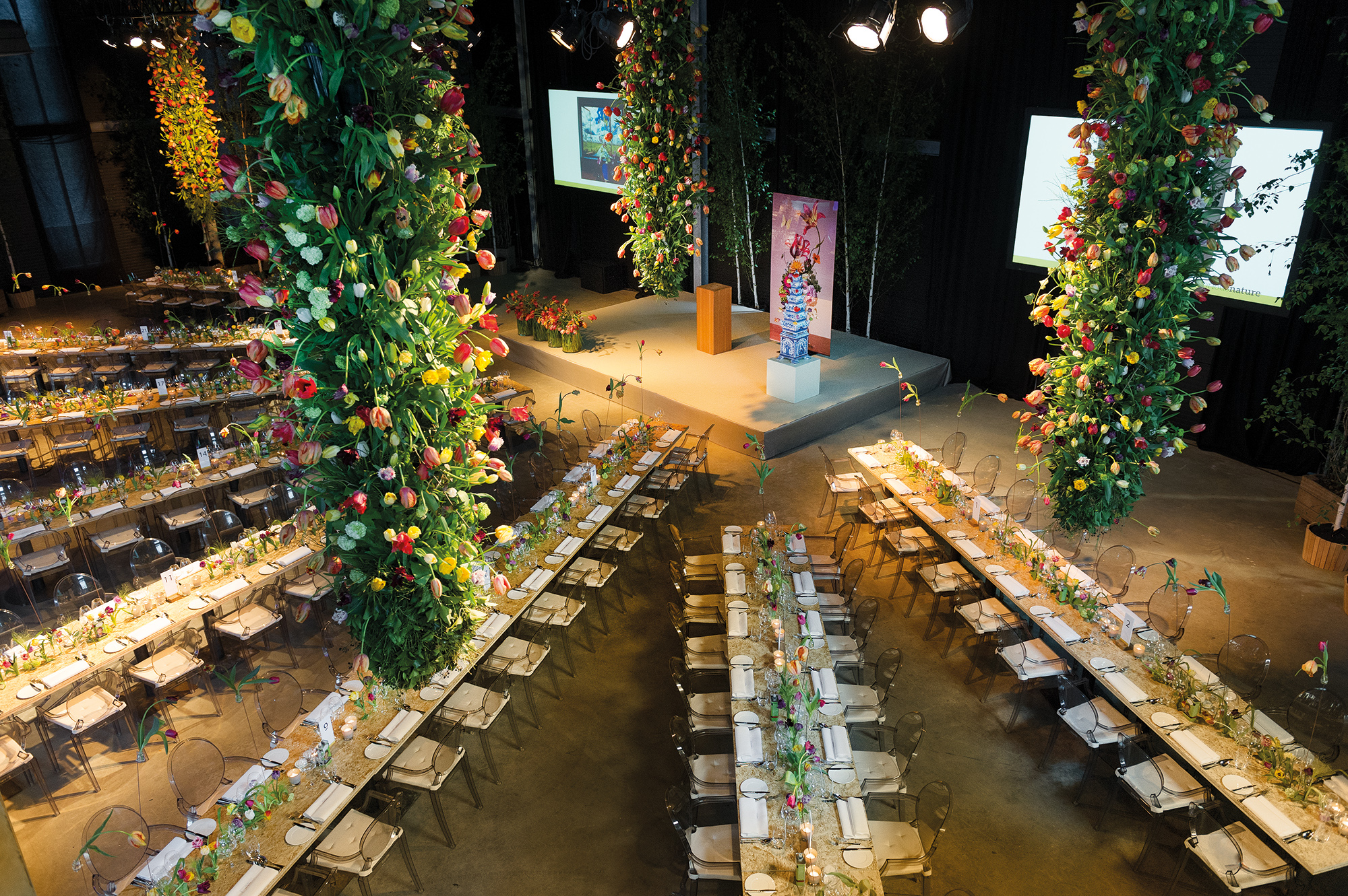 Spelen bloemen en planten daarbij een grote rol? ‘We hebben meer dan 1.000 hangplanten en 300 bomen – tot wel acht meter hoog – in de verhuur, die in te zetten zijn om een ruimte te kantelen van koud naar warm, van leeg naar geladen. Als we bijvoorbeeld in de Kromhouthal in Amsterdam tien opleggers met bomen binnenzetten, verandert de sfeer volledig. Die schaal is geen doel op zich, maar een instrument.’
