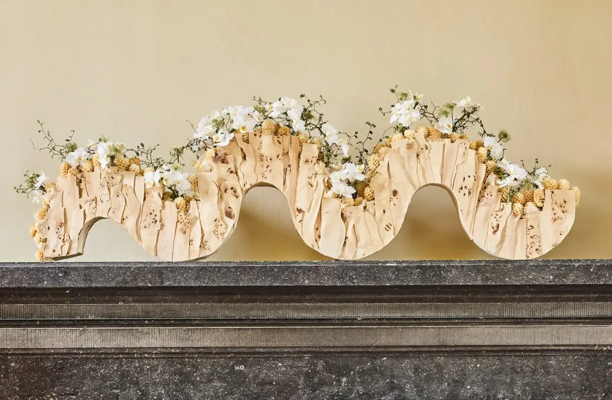 golvende vorm gecreëerd die vervolgens helemaal met tape is omwikkeld en beplakt met fijne fineerhouten plaatjes. Voor een lichte uitstraling kreeg de vorm een bekleding van ‘Angel Wings’ en aan de buiten­randen gebleekte dennenappels. Witte vlinder-orchideeën, Clematis