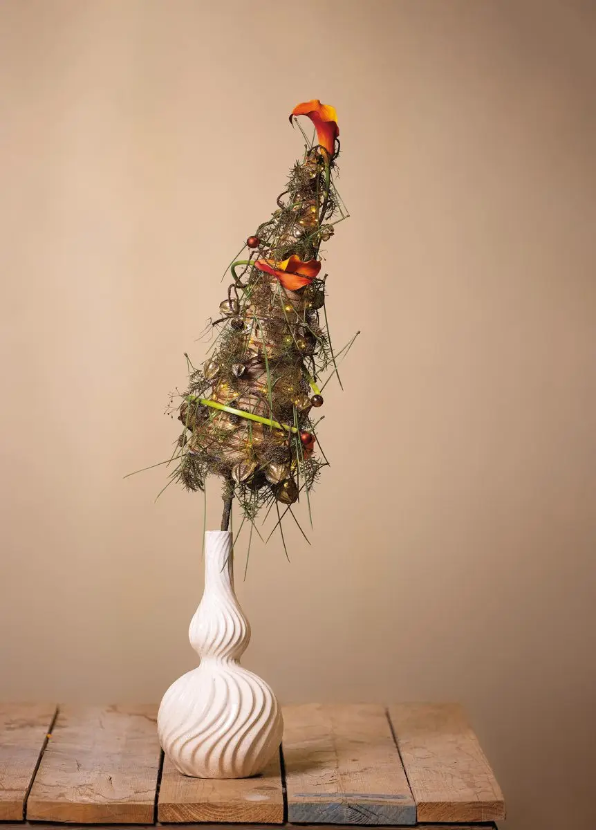 The base of this alternative floating Christmas tree is a sturdy branch with an Oasis Ideal Cone wrapped with burlap rope. A precise job in which a dot of Oasis cold glue here and there keeps the rope from shifting. Around this is loosely wrapped beaded wire with an LED light string in between. In the openings various kinds of dried flowers and fresh Christmas greens, sprayed or not gold colored, are glued. As a finishing touch, Zantedeschia was bent around and clamped and coarse pine needles were stuck all around. The bottom is finished with felt. Placed on a vase, the floating tree generates an alienating effect.