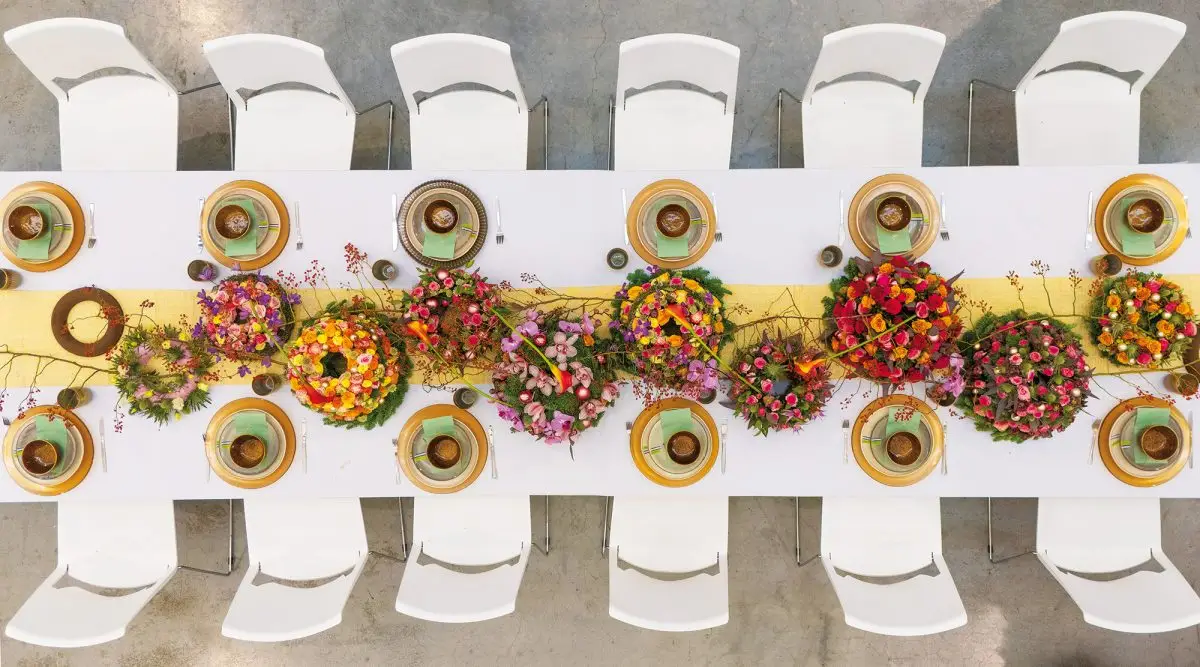 A long table is festively embellished with various round floral arrangements. The round shapes symbolize connection - which ties in nicely with the holiday season. The base of these table decorations consists of Oasis rings and existing Nobilis and moss wreaths that, to create a bit more height, are stacked. The stacked elements are easy to place and change. The Oasis wreaths are short staked with beautiful spray roses. Rosehip branches and Zantedeschia are incorporated over the stacked wreaths. Ludicrous is the way the floral arrangement presents the wine; it creates a surprising festive twist.