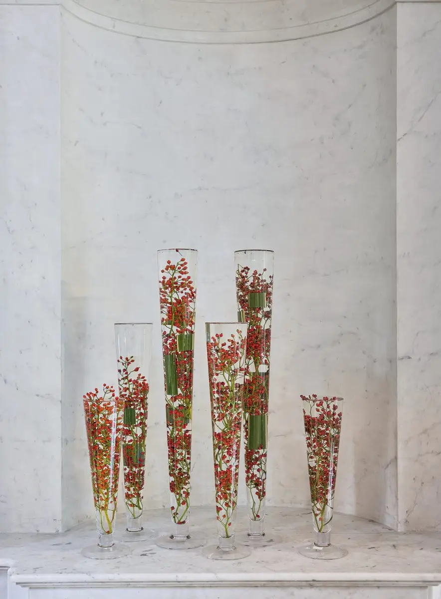 Hoge vazen gevuld met rozenbottels en rechthoekige stukken Phormium blad vormen een boeiende onderwaterdialoog. Het water vervormt en zorgt voor extra diepte waardoor de Phormium lijnen zijn verworden tot reflecties en de rozenbottels lijken te zweven in een andere dimensie.