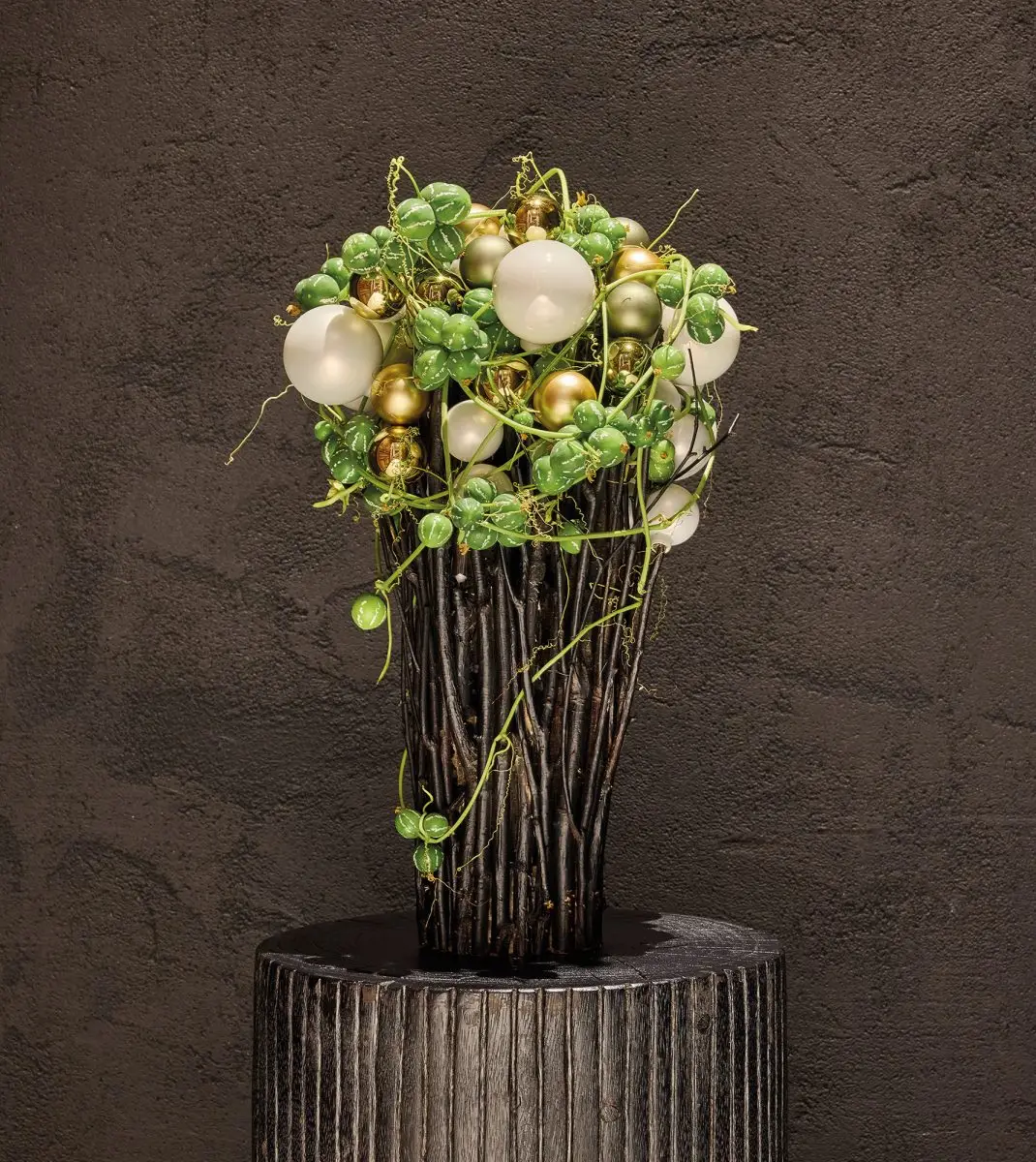 Een stevige vaasvormige takkenconstructie is zwart geverfd. De takken zijn omwonden met de knalgroene vruchtrijke ranken van Diplocyclos palmatus. Kerstballen in wit en goud benadrukken het contrast met de zwarte takken.