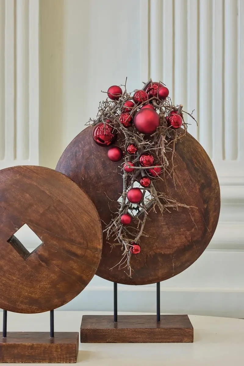 Twee schijfvormige houten sculpturen vormen de basis van dit eenvoudige kerstarrangement. Een middels metaaldraad met elkaar verbonden takkenconstructie is aan een van de schijven bevestigd. In de takkenconstructie zijn verschillende formaten glimmende en matte ‘burgundy’ kerstballen bevestigd.
