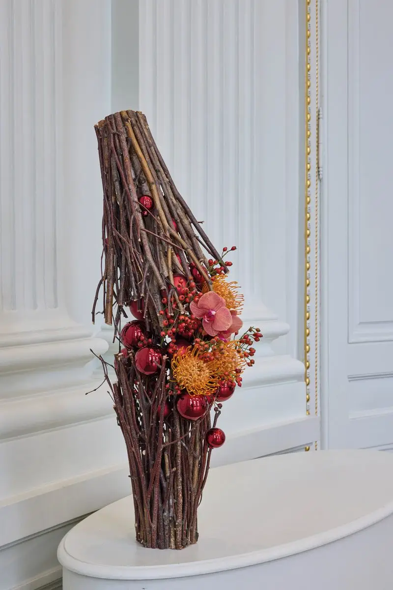 Uit takken die zich spiegelend tot elkaar verhouden, is een openstaande mand gevormd. Tussen de takken zijn wijnrode kerstballen geklemd. Rozenbottels, Leucospermum nutans en Phalaenopsis orchideeën geplaatst in glazen waterbuisjes vormen de florale invulling.