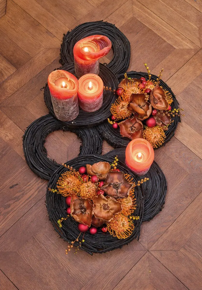 De basis bestaat uit zwart geverfde en aan elkaar bevestigde rollen berkenschors. De cirkelvormige constructies contrasteren perfect met de vier warmoranje adventskaarsen. De gedroogde bloemen, de Leucospermum nutans en de Crocosmia sluiten aan bij het kleurschema van de kaarsen. De kleine rode kerstballen geven het alternatieve adventsarrangement een feestelijke toets.
