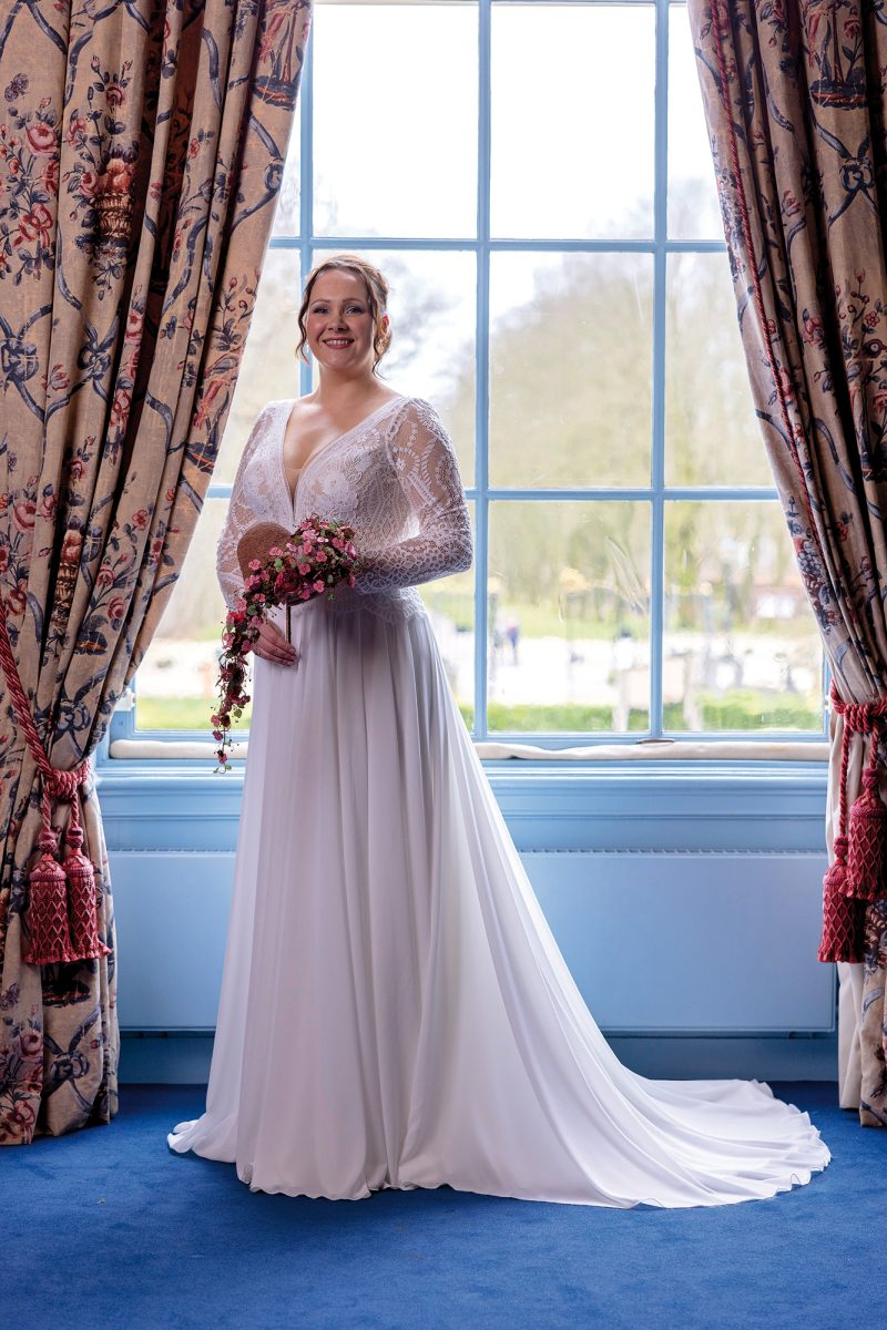 Een breed, uitwaaierend boeket met Eremurus ‘Emmy Ro’, Gladiolus ‘Live Oak’ en diverse grassen. In de mat geglazuurde schaal zorgen cacaovruchten in dezelfde warme bruinrode tint voor extra textuur.