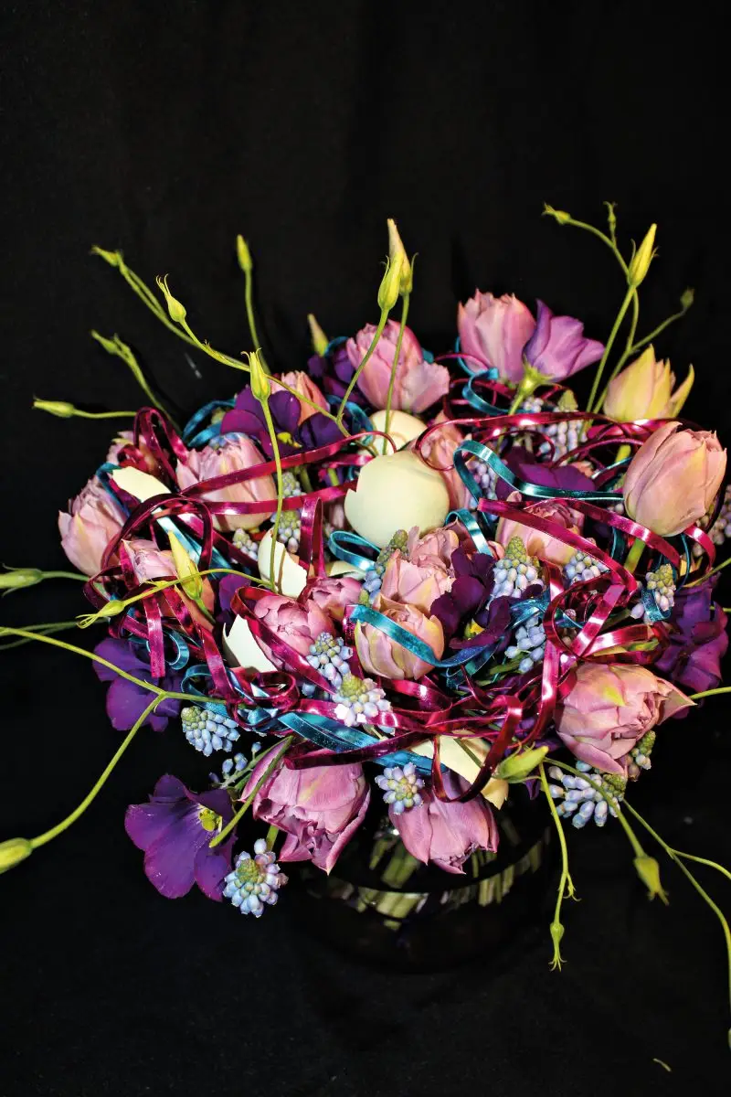 Pour Magdalena Kahlina, un bouquet n'est pas seulement une forme, mais un moyen de transmettre des émotions à travers les fleurs. « J'ai créé ces bouquets en partant du sentiment. L'émotion est subtile et discrète, mais présente dans chaque détail. Les fleurs ne sont pas traitées comme des décorations, mais comme des éléments expressifs, qui contribuent chacun à travers le rythme, la ligne, la texture et l'espace. » Le bouquet comprend notamment des tulipes « Double Price », des muscari et des lisianthus « Botanic Blue ».