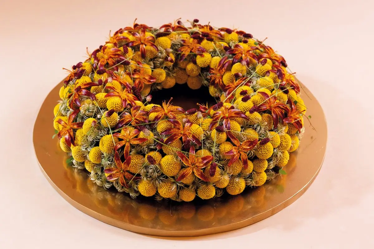 Een Bio krans van OASIS is opgestoken met Craspedia ‘Paintball Pop’, Clematis Amazing Kibo, Lilium martagon ‘Arabian Knight’ en Sanguisorba ‘Red Dream’.