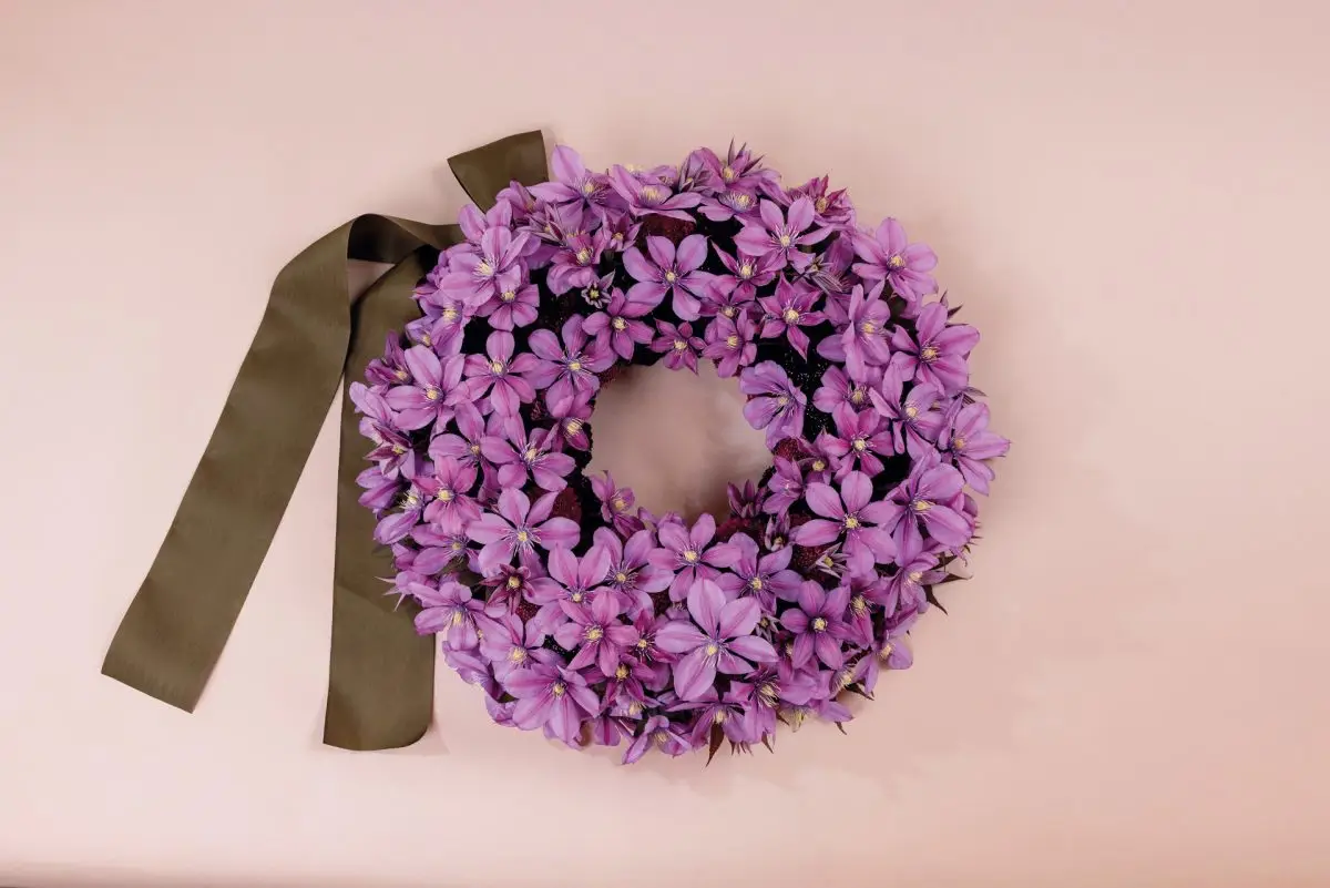 Een OASIS Bio krans is opgestoken met Scabiosa Bon Bon Scoop Maraschino, Scabiosa Dark Cherry Scoop en Clematis Amazing Tokyo. Deze intense kleurencombinatie versterkt de schoonheid van de bijzondere Clematis en geeft het een ongedwongen en natuurlijke uitstraling.
