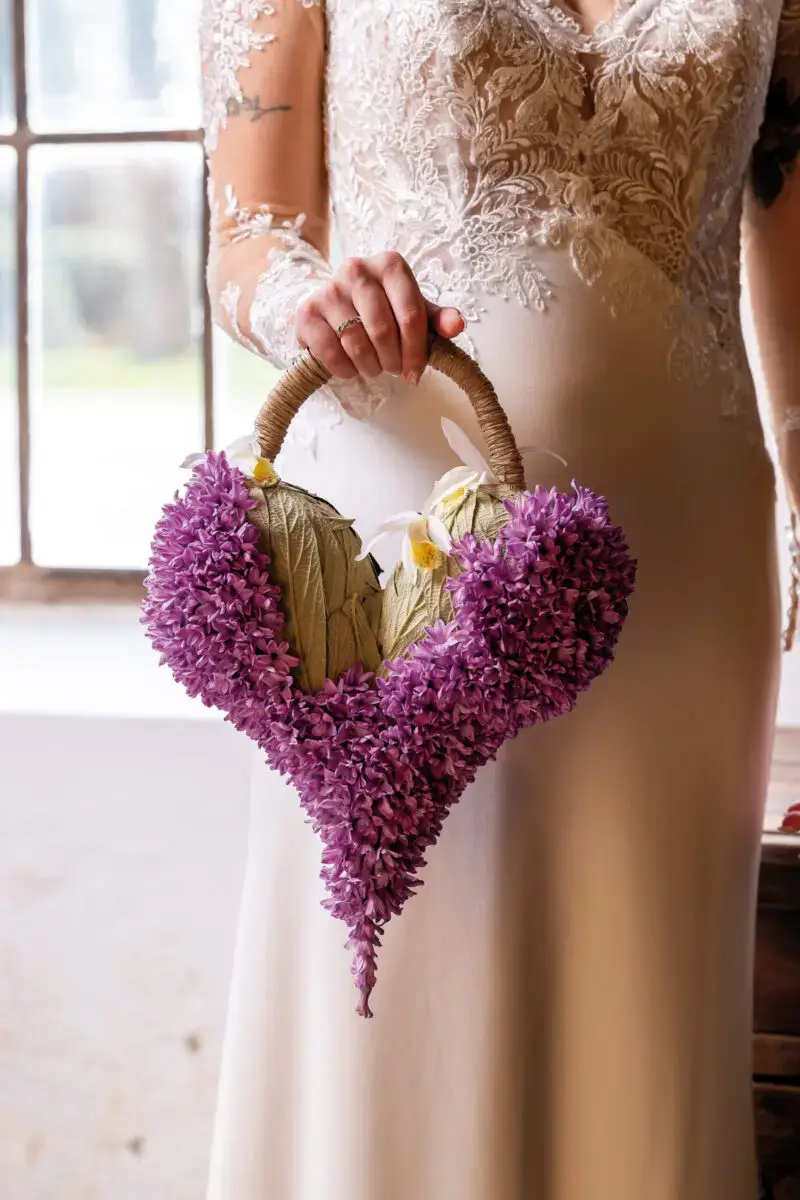 De basis van het bruidsarrangement is een metalen ring, symbool voor eenheid en verbinding. De ring is volledig opgedraaid met diverse plantaardige materialen, wat zorgt voor een natuurlijke en speelse structuur. De materialen zijn zorgvuldig bevestigd met draad-, bind- en lijmtechnieken. O.a. Chrysanthemum, Scabiosa, Sandersonia, Phalaenopsis en Gloriosa, aangevuld met mooi getekend Begonia blad en een waterval van ranken van Ceropegia woodii, zijn verwerkt tot een levendig geheel dat prachtig in balans is.