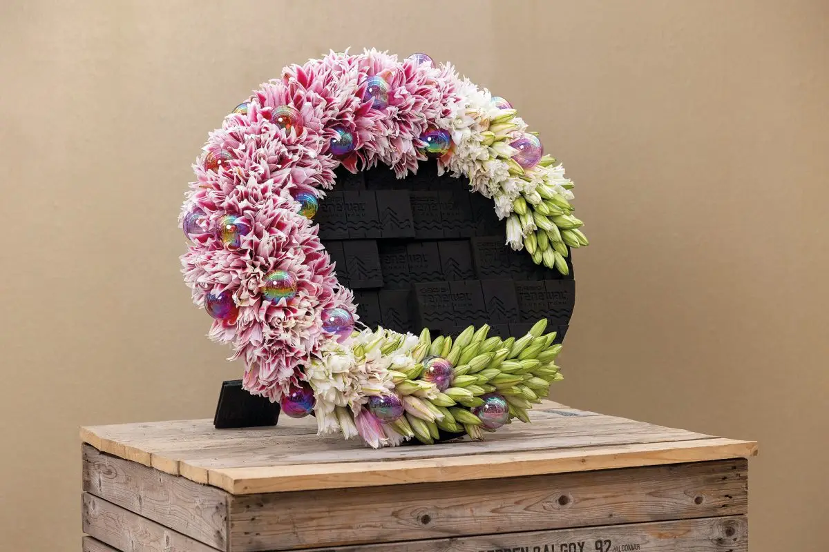 Deze stijlvolle krans is gepresenteerd op een houten ondergrond met een ambachtelijk karakter. Daarop is Oasis Renewal steekschuim bevestigd ­– een stevige duurzame basis met een elegante diepzwarte kleur. Hierop is de Rose Lily van Decorum gestoken in een sierlijke maanvorm. De verfijnde uitstraling van deze bijzondere lelie komt prachtig tot zijn recht tegen het contrasterende zwart – het geheel vormt een chique, moderne schikking die vakmanschap toont.