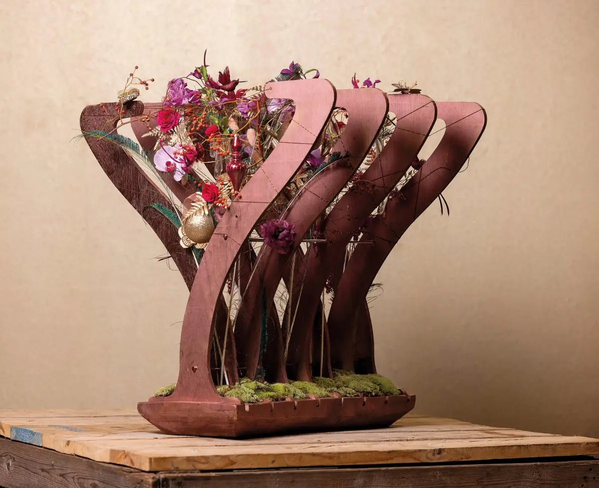 Een houten trog met daarin bolmos en een frame van hergebruikte houten elementen kan zowel op de grond geplaatst als vrij in de ruimte op een sokkel gezet – om van alle kanten te bewonderen. Het object blijft door de verschillende texturen en structuren de aandacht trekken. Trosrozen, orchideeën, Clematis en lisianthus zijn in glazen waterdragers geplaatst. Rozenbotteltakken, pauwenveren, goudkleurig varenblad (zijde), zalmroze Lagurus, kerstornamenten, papieren vlinders en sierlijke kolibries zorgen voor speelse verbinding.