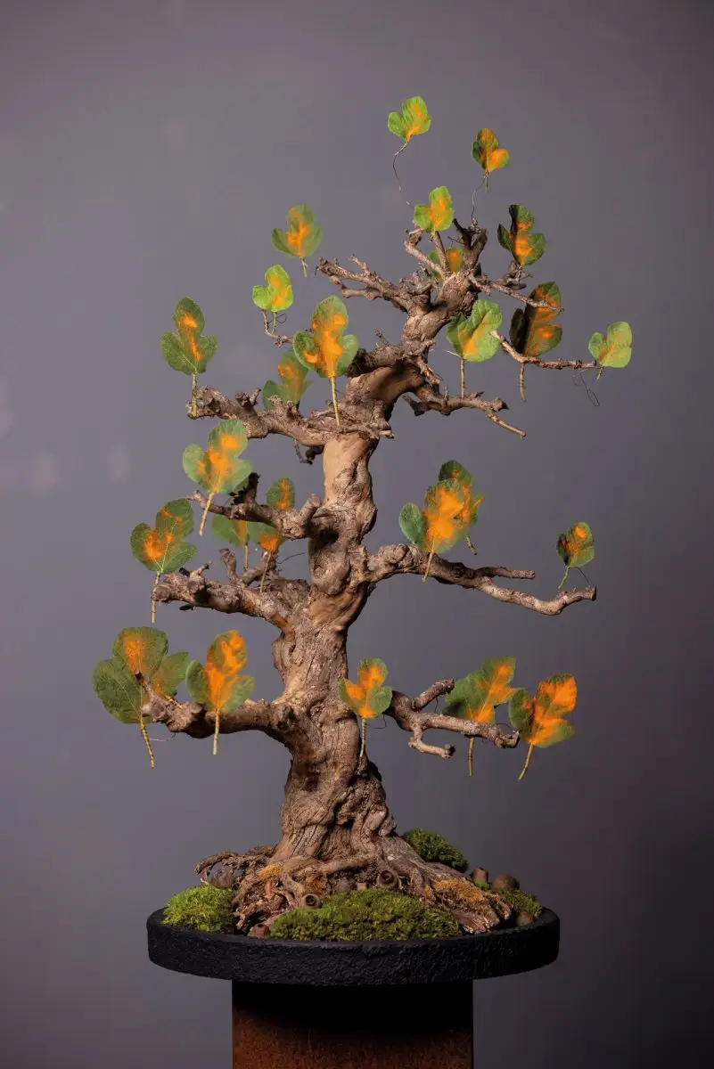 Op een 75 jaar oude bonsaistam van Acer zijn op koperdraad gezette vijgenbladeren (Ficus carica) bevestigd en licht bestoven met oranje levensmiddelenpoeder. Aan de voet van de stam is bolmos geplaatst met daarbij doosvruchten van Eucalyptus.