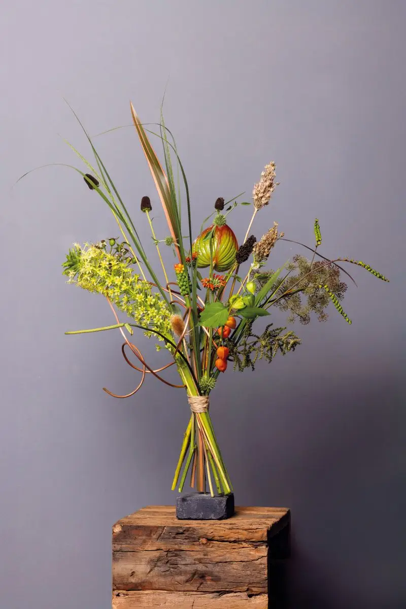 ‘Tijdens de herfst ben ik graag buiten. Het gedempte licht, de geuren en de robuuste vormen – die door het afvallende blad meer tot uiting komen – in combinatie met vruchten en zaad vormen. Ik verzamel in dit seizoen ook basismateriaal uit de tuin om in de winterperiode te gebruiken voor mijn arrangementen.’