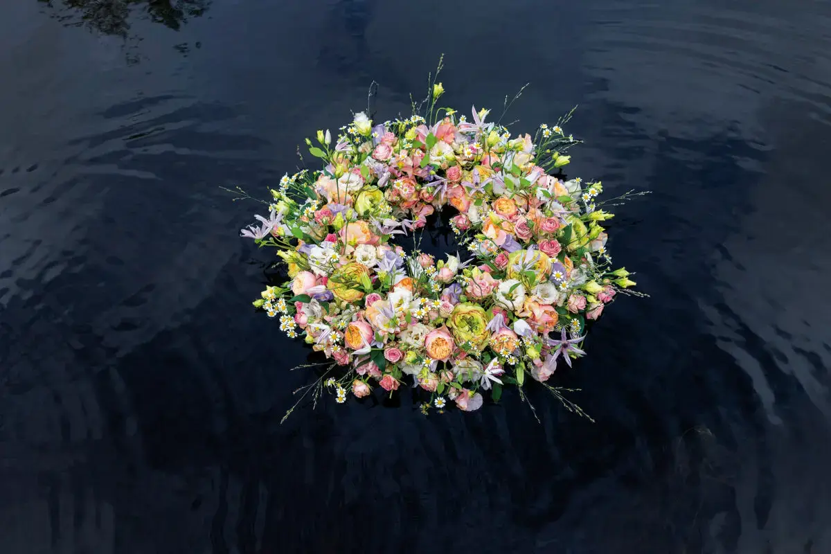 Een boeket met alle tinten zalm, oranje en roze ‘gevangen’ in een cirkel van Panicum grassen. Voor een rond frame zijn Chaenomeles takken, waaraan mooie dikke bloemknoppen op uitlopen staan, samengebonden. Hiertussen zijn de bloemen gestoken: Campanula, Limonium, Tagetes, dille, Ranunculus ‘Butterfly’ en de trosroos ‘Femke’.