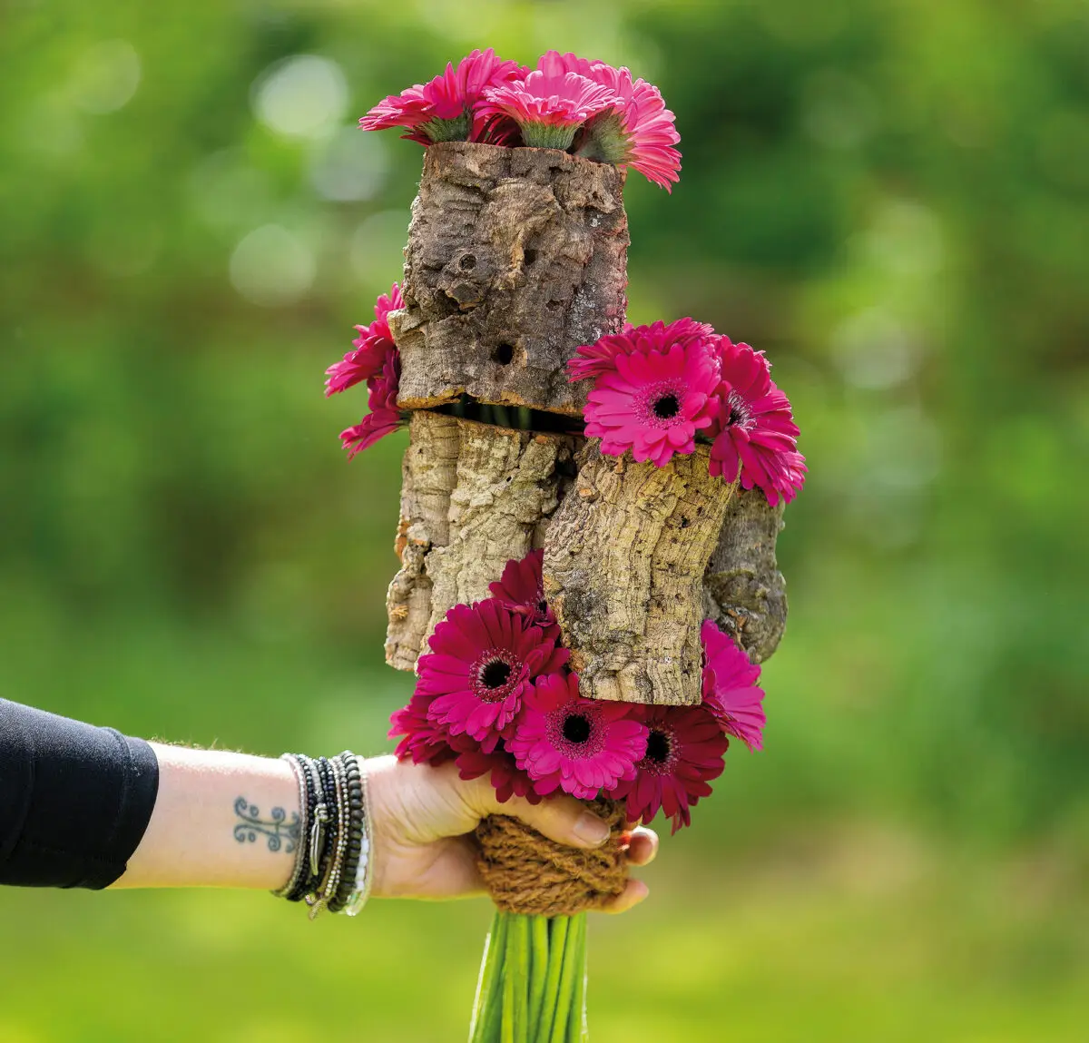 Een BIO-krans van Oasis vormt de duurzame basis. Hierop ligt een strokrans die volledig is beplakt met schelpen, zorgvuldig gestapeld voor een speels en natuurlijk effect. Ook tussen de bloemen zijn schelpen (op stokjes) verwerkt. De toevoeging van rozerode Rosa ‘Star Trek’, Achillea, Eustoma, Gerbera en Freesia maakt dit arrangement tot een harmonieus geheel.