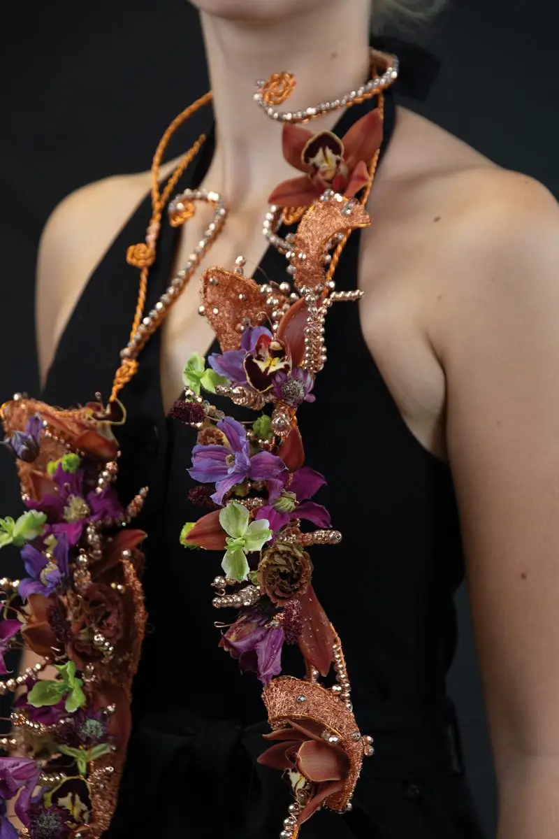 It’s party time! Met deze rondom de nek gedrapeerde florale bodywear steel je de show tijdens elke feestelijke gelegenheid. Het halssieraad is gecreëerd van Oasis koperkleurig aluminium draad en koperkleurig bouillondraad gedecoreerd met koper- en goudkleurige kralen. De gebruikte bloemen zijn onder andere Cymbidium orchideeën, terracottakleurige lisianthus, Alstroemeria en Clematis.