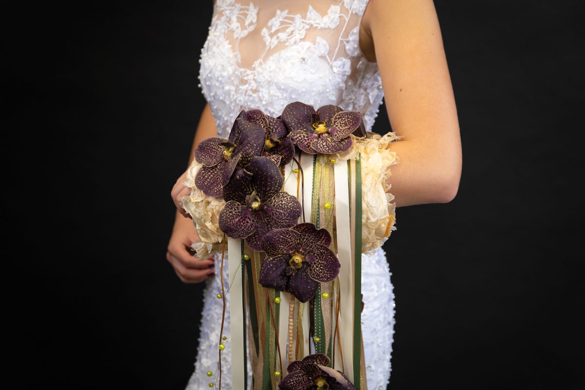 Deze winterse bruidsmof is voorzien van een waterval aan prachtige chocolade kleurige Vanda orchideeën, aangevuld met linten in de kleuren groen, crème en beige en een delicaat snoer van groene kralen.