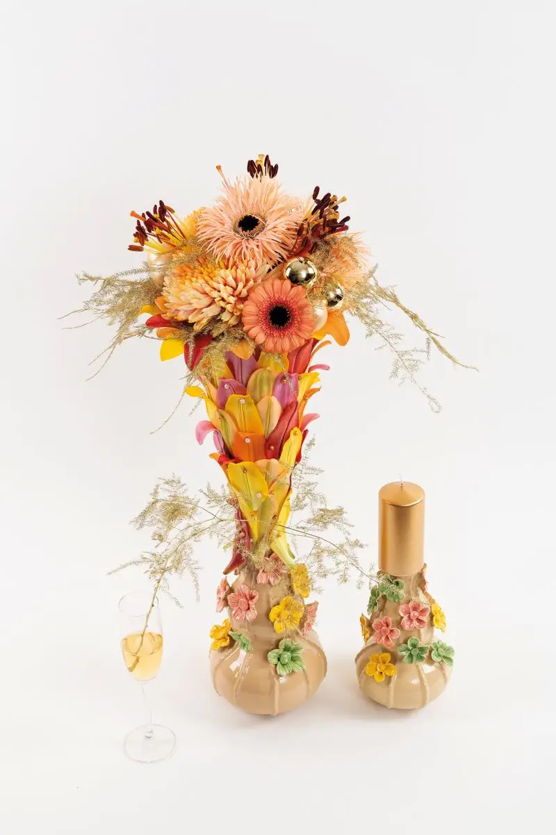 Jarenlang vermeden ontwerpers het gebruik van rijkelijk gedecoreerde vazen ​​met smalle halzen in hun werk. Frédéric omarmt ze en creëerde daarbij, met een fantastisch kleurgevoel, met lelie bloemblaadjes een showstopper.