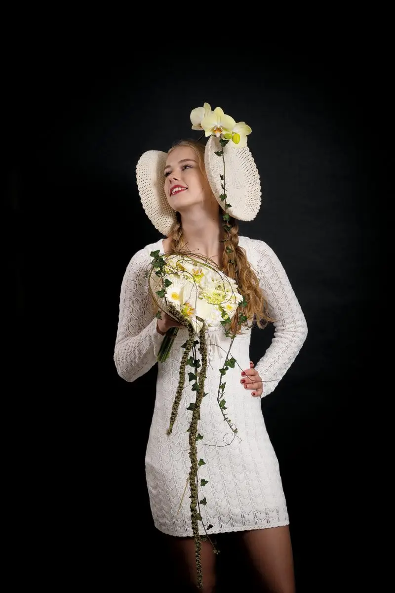 Geïnspireerd door de jurk van het model is een boeket en een headpiece gecreëerd waarin de vorm van de structuren tezamen met prachtige Phalaenopsis orchideeën centraal staan.