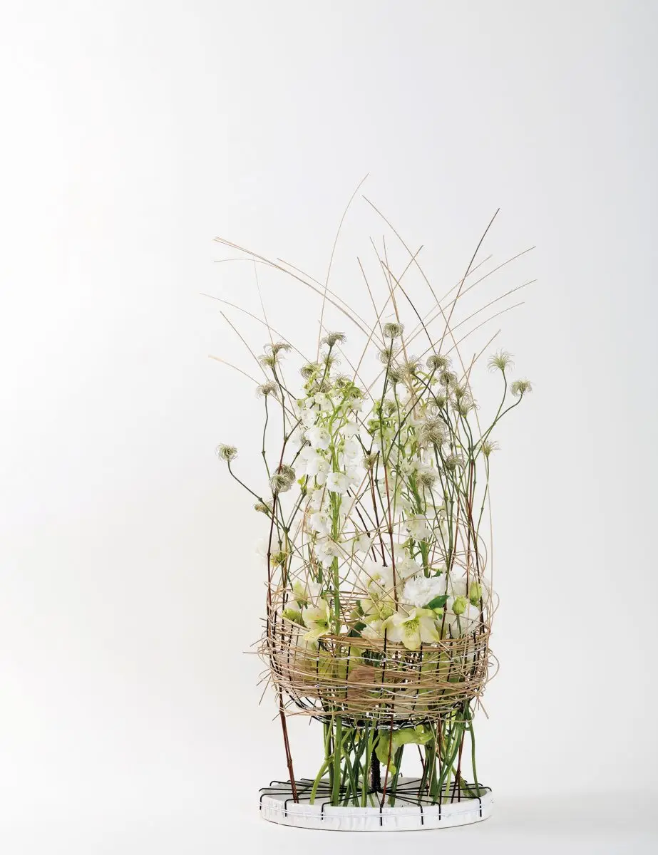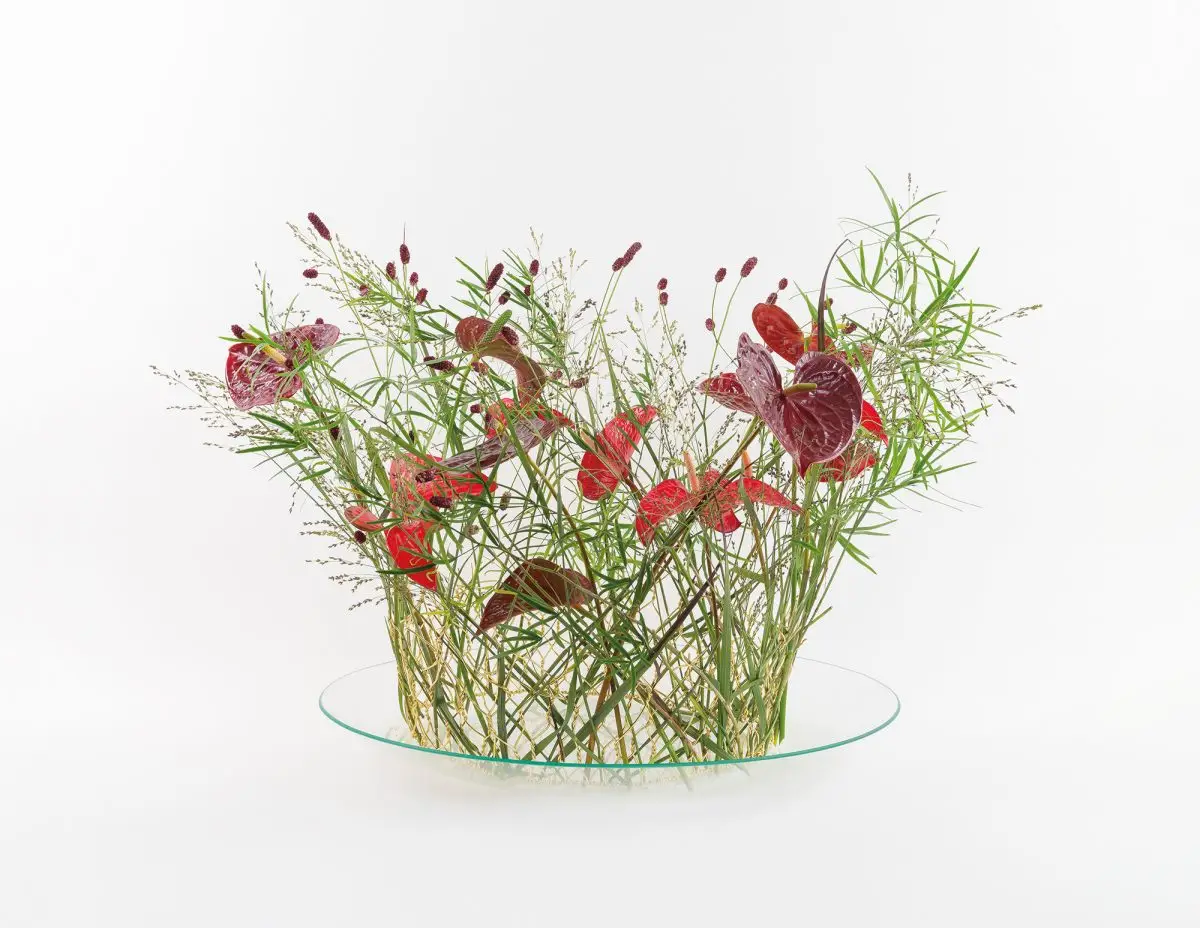 Scandinavische ontwerpers staan ​​bekend om het gebruik van transparantie in ontwerpen om daarmee elke individuele bloem in de spotlight te zetten. De grasconstructie houdt de stelen perfect op hun plek en in het water.