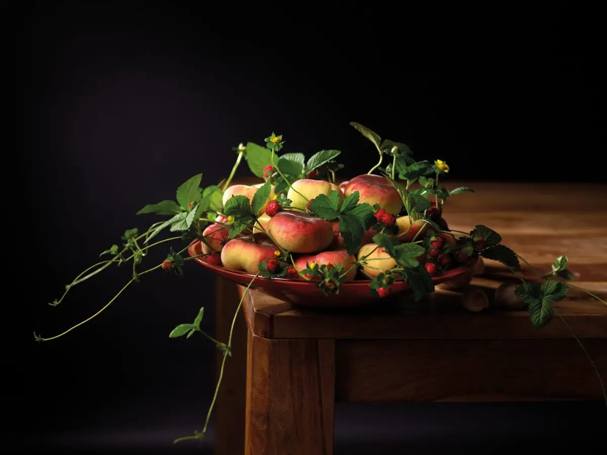 Inspired by the painting Still Life with Wild Strawberries (1705) by Adriaen Coorte, on display in the Mauritshuis in The Hague. The simple yet striking composition features a stacked arrangement of wild peaches (Prunus persica), interwoven with delicate tendrils of Duchesnea indica, placed in OASIS® Renewal Floral Foam. Its beauty lies in its simplicity and refined focus on form, enhanced by dramatic lighting – a hallmark of the Dutch Golden Age still life painters.