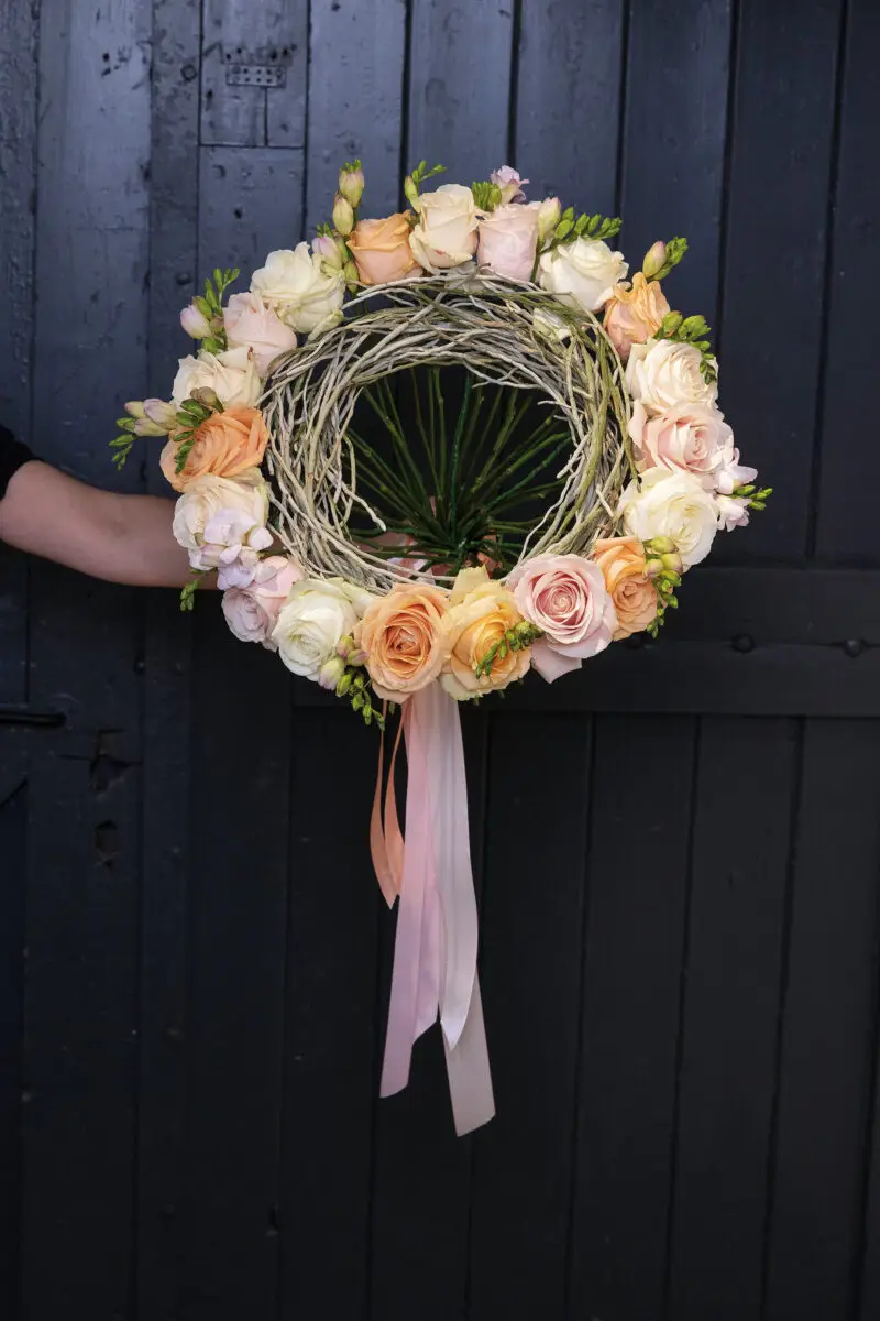 Een hart van zilverkleurig aluminiumdraad (2 mm) krijgt een zachte, zilvergrijze huid v an Calocephalus brownii. Het wordt vastgezet door wikkelen met zilverkleurig bouillondraad. Binnenin is met fijne bloemetjes een tweede, intieme kleine hartvorm gelijmd – een mooie symboliek. Gebruikte materialen: Chrysanthemum, Scabiosa, Tillandsia, lisianthus, Clematis Amazing Kibo, mini Phalaenopsis en blad van Kalanchoe.