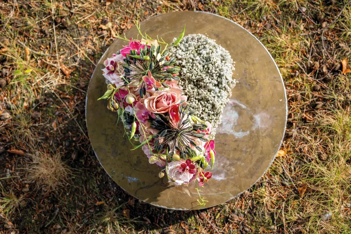 Een duurzaam object van karton, rondom beplakt met gedroogde zonnebloempitten voor textuur. In de geribbelde kartonnen blokken zijn een aantal mooie Rosa ‘Corallo’ takken geplaatst met wat ranken van de Cardiospermum halicacabum ‘Love in a Puff’. De open structuur laat zich kort voor de plechtigheid vullen; lijnen, pluimen en zaad dozen geven ritme en reliëf en maken personalisatie met tuin bloemen mogelijk. Materialen: siergrassen, pimpernel (Sanguisorba), uitgebloeide Agapanthus met zwarte zaad dozen, Crocosmia en Heliopsis.