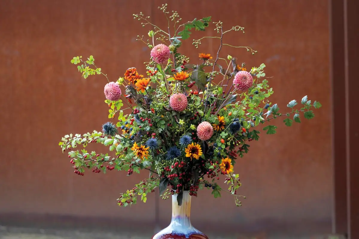 Een royaal boeket symboliseert de overgang van de nazomer naar de herfst. Krachtige takstructuren gecombineerd met Rosa ‘Corallo’ takken, bessen en volle bloemkoppen. De gelaagde opbouw en het rijke kleurverloop maken het boeket tot een echte blikvanger voor entree of balie. De sculpturale vaas onderstreept de showstopper-allure om al bij de entree het nieuwe seizoen welkom te heten. Gebruikte materialen: sleedoorn, meidoorn, rozenbottels, Heliopsis, Dahlia.