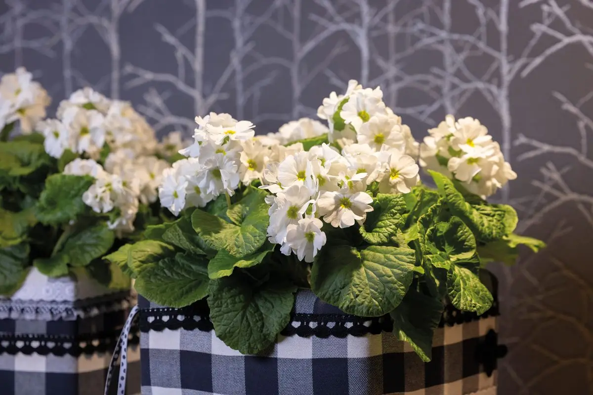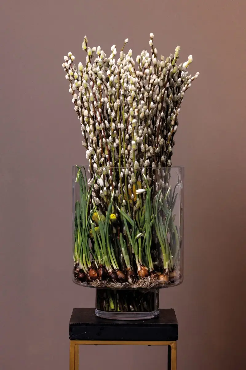 Potloodnarcissen lenen zich volgens Miranda ter Voorde goed voor het maken van leuke bundeltjes. ‘Ze zijn vaak betaalbaar en juist door zo groots uit te pakken en het geheel aan te vullen met materialen zoals in dit arrangement, krijgt het een luxe uitstraling. De bundels zijn snel te vervangen als ze zijn uitgebloeid. Door een windlicht te gebruiken, kan ik transparant in laagjes werken met alle materialen, maar toch de luchtigheid vasthouden. De narcissen heb ik eerst kop op kop samengebonden. Vervolgens legde ik de samengebonden katjes er als een matje verticaal op. Op de rand zorgen uitgespoelde sneeuwklokjes voor nog meer gelaagdheid.’