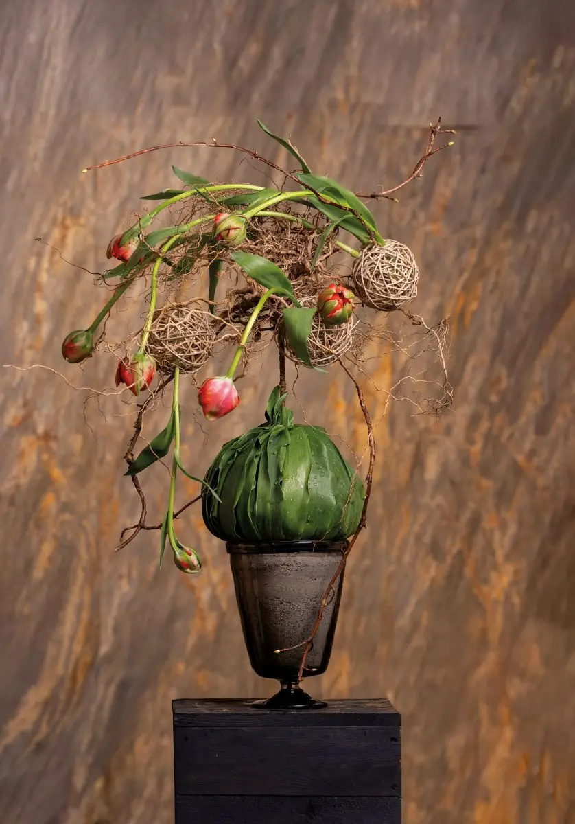 Een Oasis-bol is zorgvuldig bekleed met tulpenblad en verbeeldt zo een gestileerde bloembol. Daarboven rijst een verfijnd, organisch frame op, samengesteld uit een oud wortelgestel en bollen van pitriet. Vanuit deze constructie ontvouwen de pioentulpen zich, alsof ze vanzelf uit de bol tevoorschijn komen en een natuurlijke, vloeiende lijn volgen. Het bloemwerk is geplaatst op een glazen vaas die rust en stevigheid geeft aan het geheel. De bolvorm speelt de hoofdrol in dit arrangement en vormt de verbindende factor tussen basis, constructie en bloem.