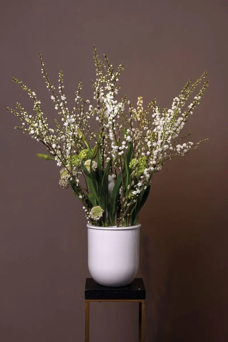 Eenvoud in veelvoud (en herhaling) maakt vaak de prachtigste arrangementen. De kunst is om de balans te zoeken en met een kleine imperfectie het geheel spannend te houden om naar te kijken. Dit arrangement is een eigentijdse uitvoering van de ouderwetse tulpenvaas. Door de bloesems wijds te schikken, met daartussen lange tulpen, tere Scabiosa en frisgroene Viburnum, werd deze ode aan de tulp gecreëerd.